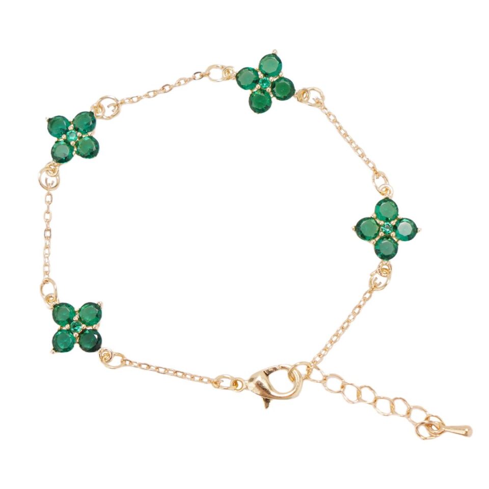 【Bracelet】Gold-Tone Floral Green Cubic Zirconia Bracelet Four Flower Motifs Adjustable Chain Elegant Women’s Jewelry