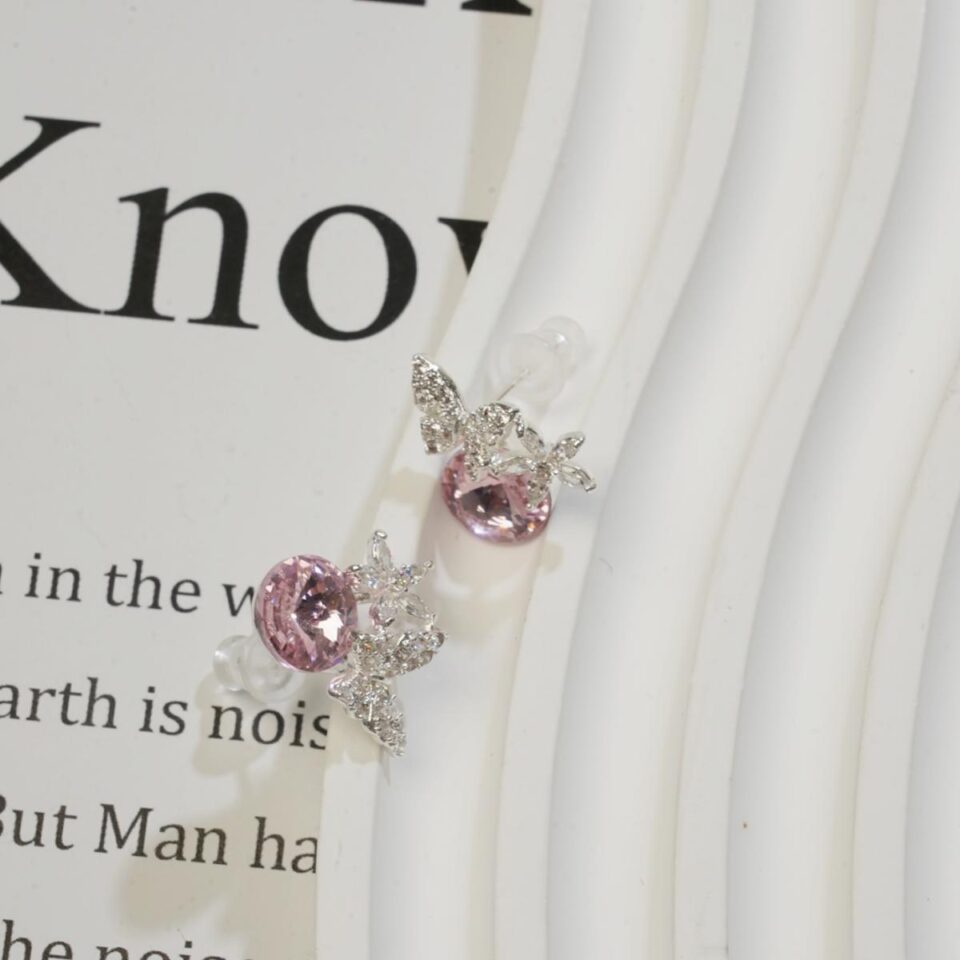 【Stud Earrings】Women Pink/Purple Crystal Earrings, Silver Butterfly & Flower Design, Sweet & Delicate, For Elegant Women