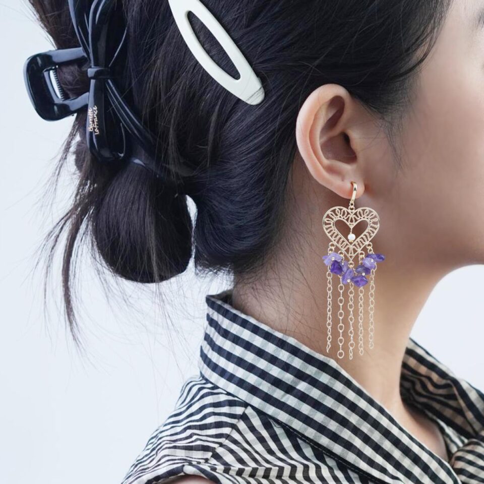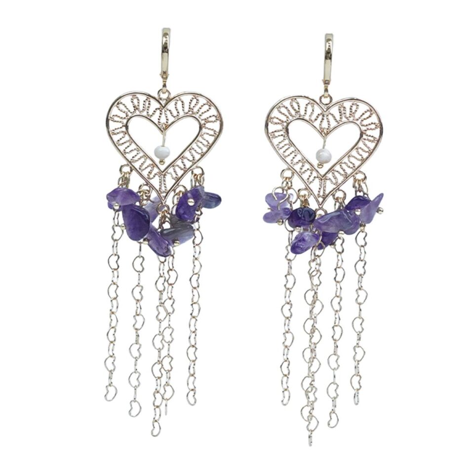 【Earrings】18K Gold Plated Heart Tassel Earrings with Natural Amethyst & Pearl, Romantic Design for Women