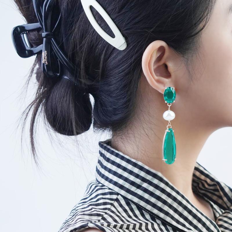 【Earrings】Chinese Art Grass & Pearl Drop Earrings Green Gradient Copper Chain Lightweight Earring for Women