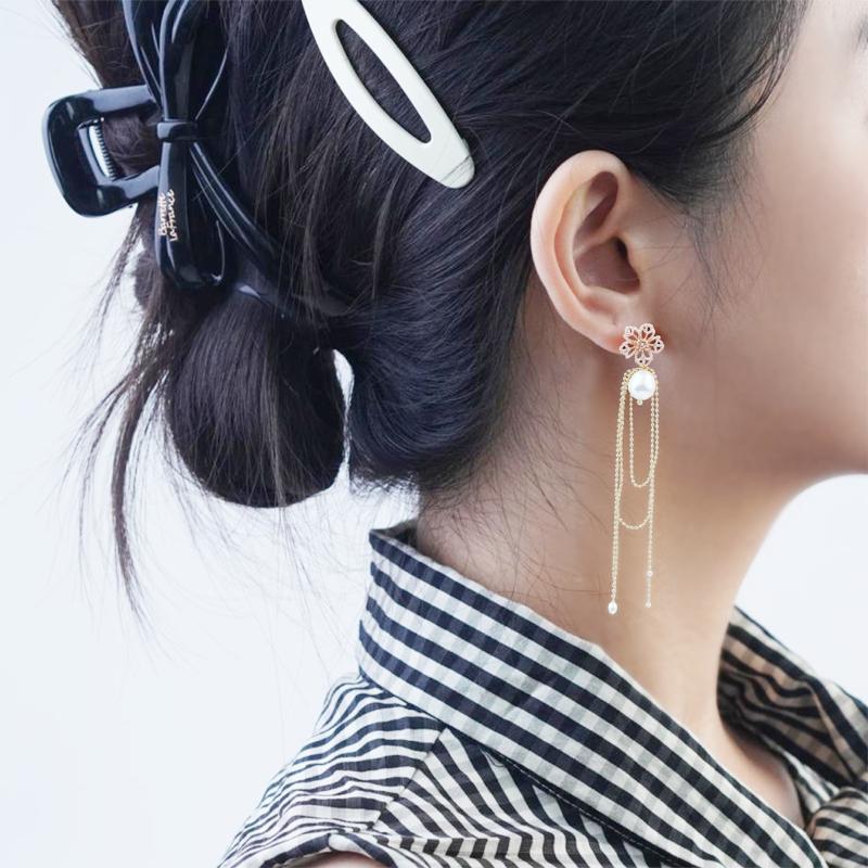 【Earrings】Layered Petal Pearl Earrings Gold Bead Chains Asymmetrical Dangle Lightweight Design for Ladies