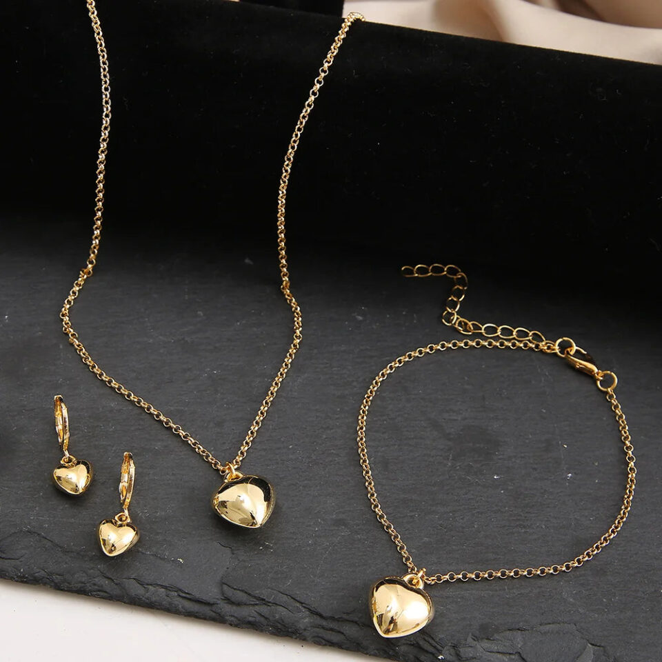 Exquisite Heart Earrings Necklace Women’s Bracelet Fashion Simple Romantic Pendant Gold Color Jewelry Set
