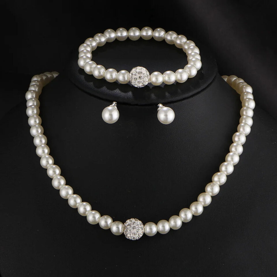 Fashion Woman Bride Wedding Pearl Jewelry Set for Women Rhinestone Faux Pearl Necklace Bracelet Earring Wedding Party Jewelry