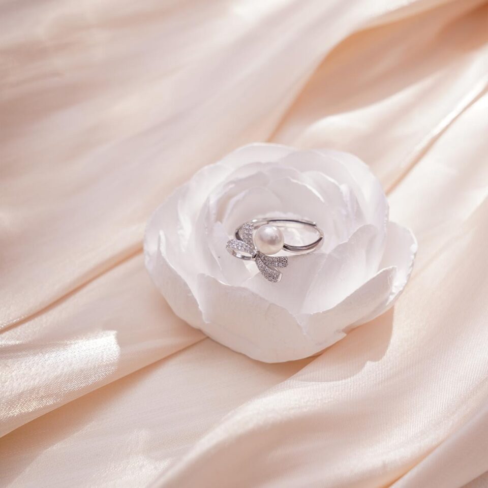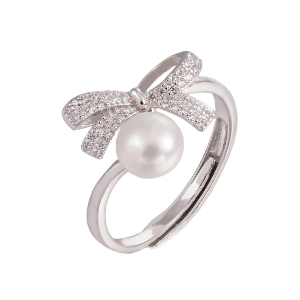 【Ring】Silver Bow Ring with Natural Freshwater Pearl, Elegant Gift, Adjustable Ring Fit All, Perfect for Women