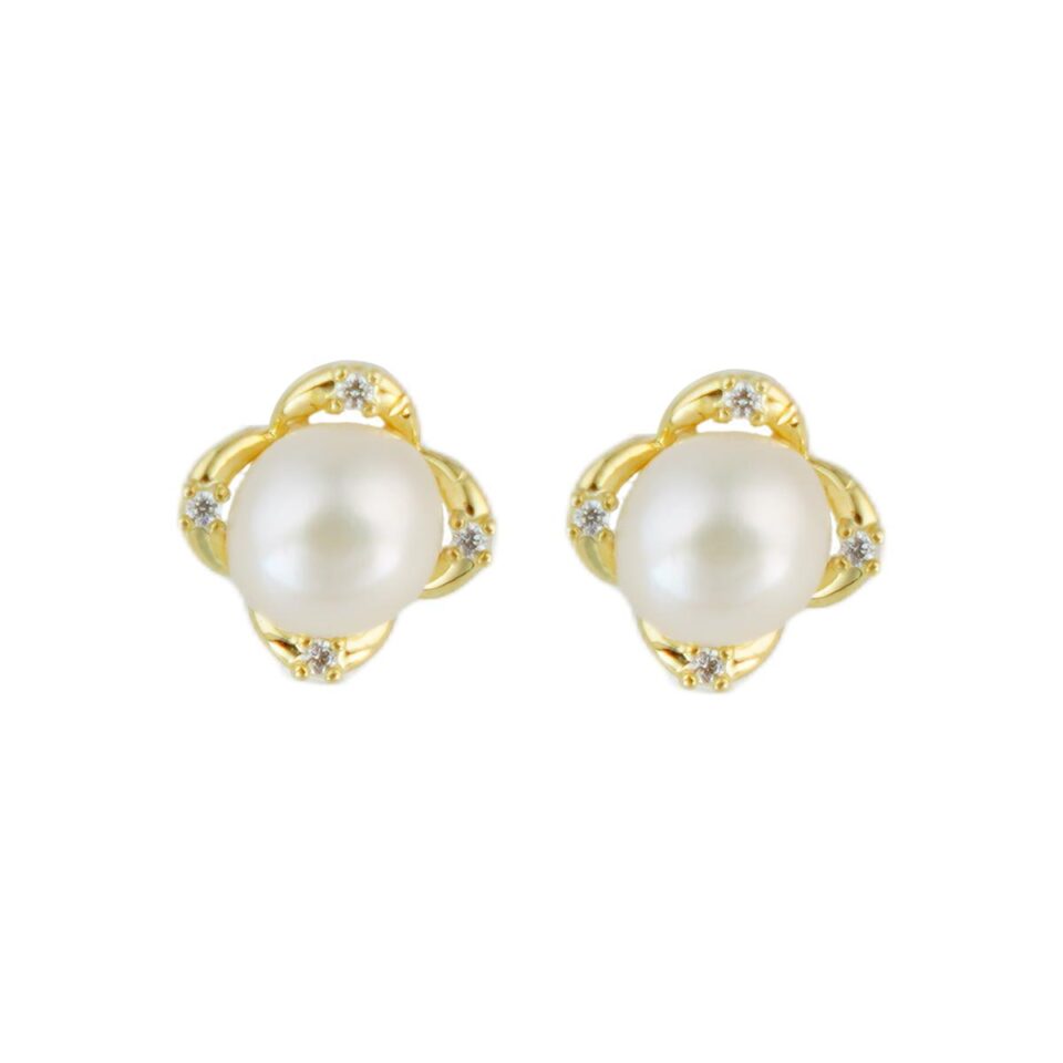 【Stud Earring】Golden Floral Elegant Natural Pearl Stud Earring with Silver Post, Perfect Gift for Lover