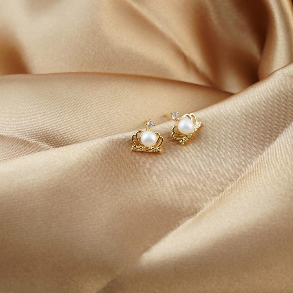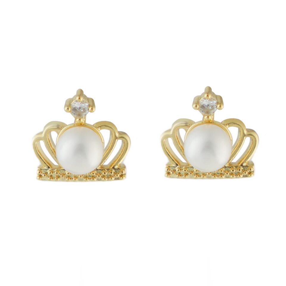 【Stud Earring】Golden Crown-Shape Natural Pearl Stud Earring with Silver Post, Luxury Elegant Jewelry for Women