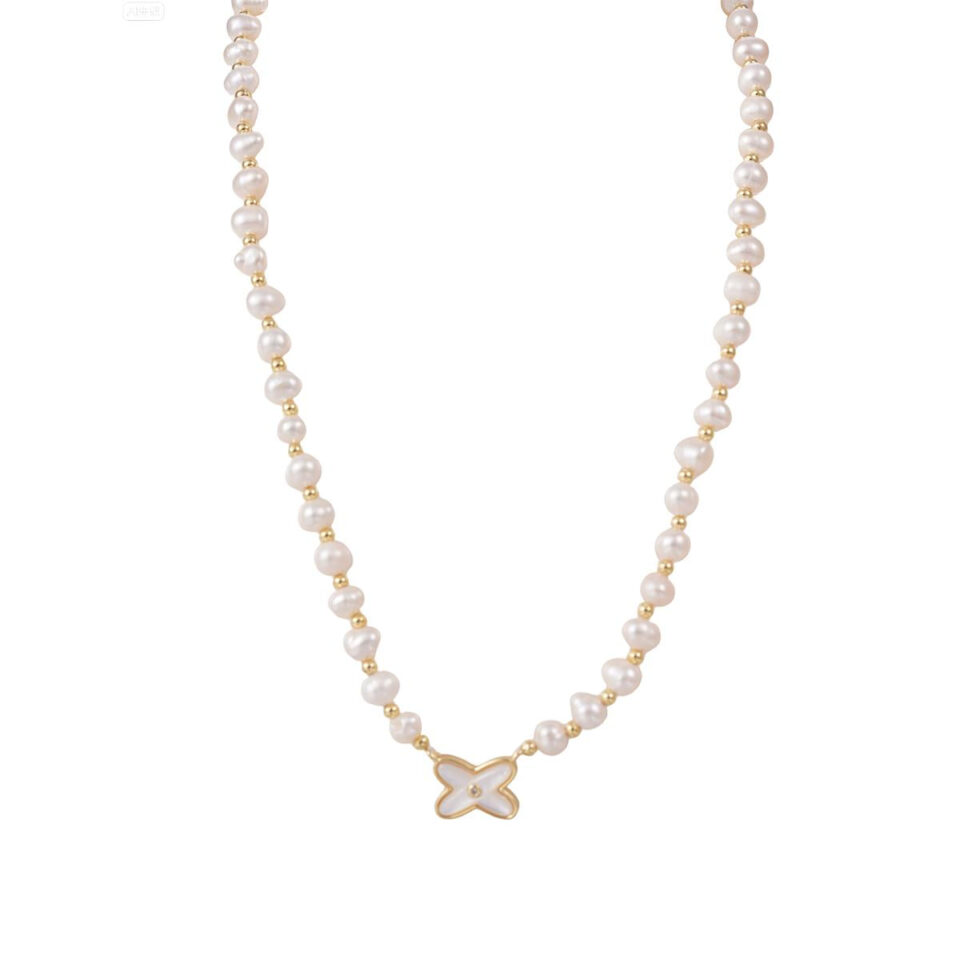 【Pendant Necklace】White Pearl & Gold Brass Beaded Chain with Clover Shell Pendant Necklace Versatile Daily Jewelry Gift Lucky Charm for Women
