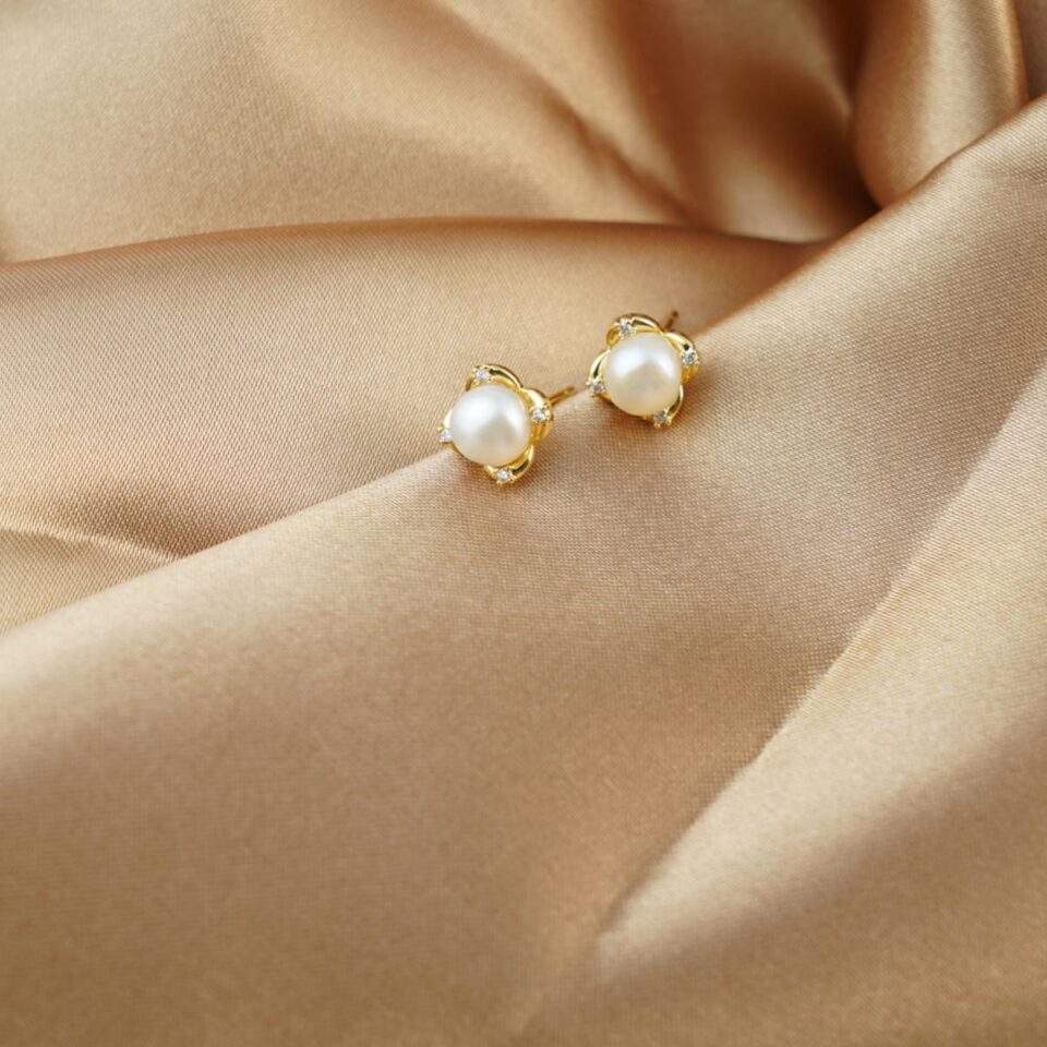 【Stud Earring】Golden Floral Natural Pearl Stud Earring with Silver Post, Classic Jewelry Lightweight Design for Women Everyday Wear