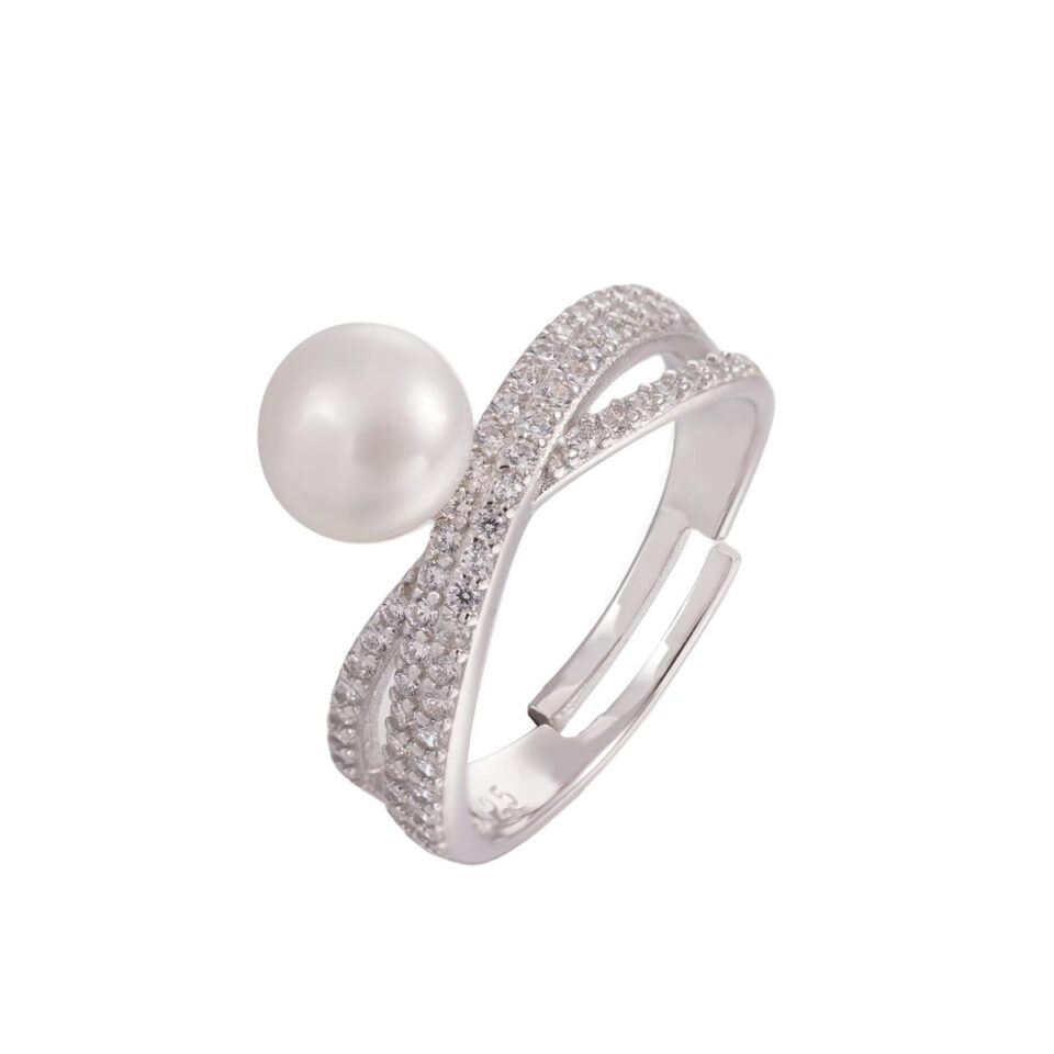 【Ring】Silver Ring Natural Freshwater Pearl, Shining Zircon Cross-Band Design, Elegant Jewelry for Women, Perfect Gift for Lover