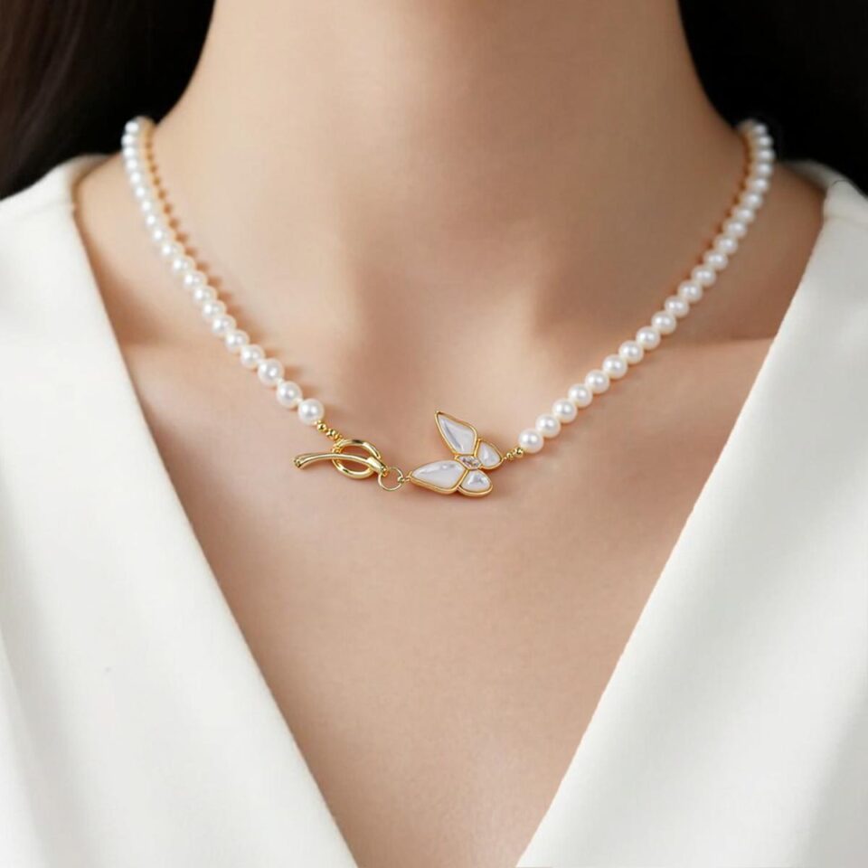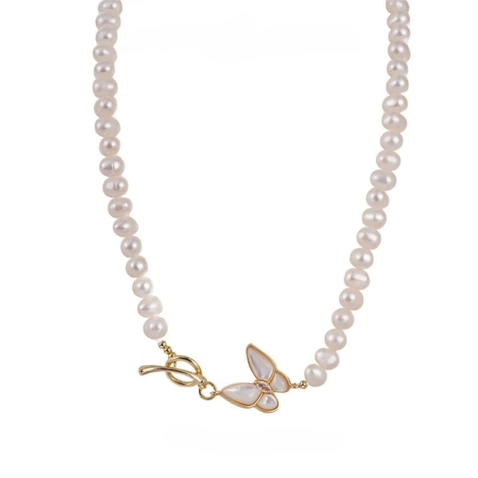 Elegant Natural Freshwater Pearl Necklace – Butterfly Accent – Feminine Charm for Everyday Wear