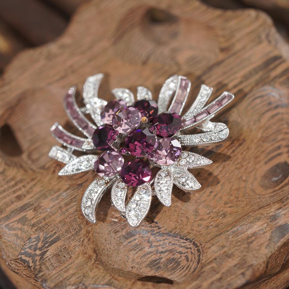 Women’s Floral Brooch with Purple Zircon Bloom, Glitter Leaves for Elegant Events