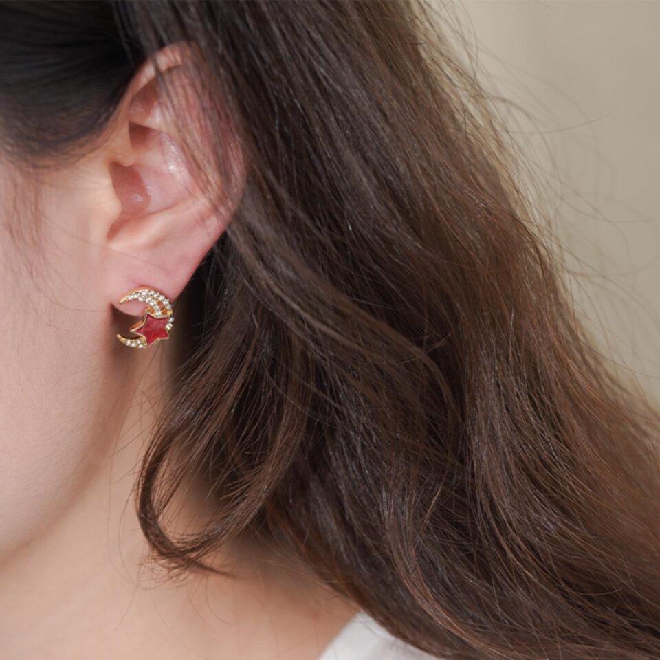 【Stud Earrings】Gold-Plated Alloy Star-Moon Studs – White Rhinestone-Edged Design for Gifts