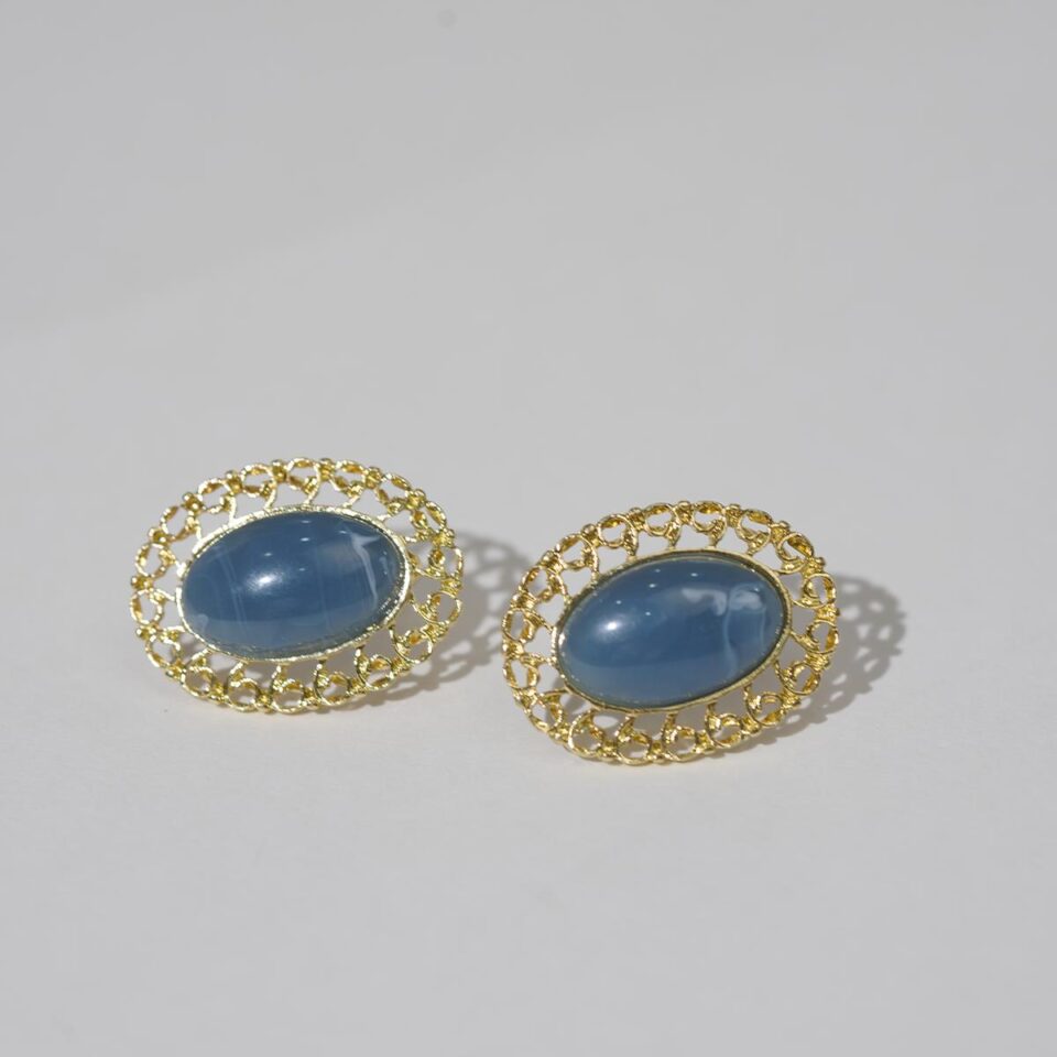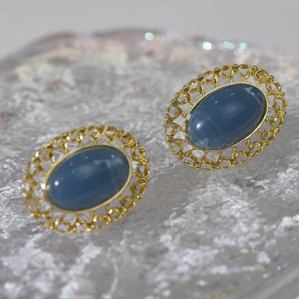 【Stud Earrings】Golden Openwork Scroll Frame Studs with Blue Gemstones, Elegant Vintage Style