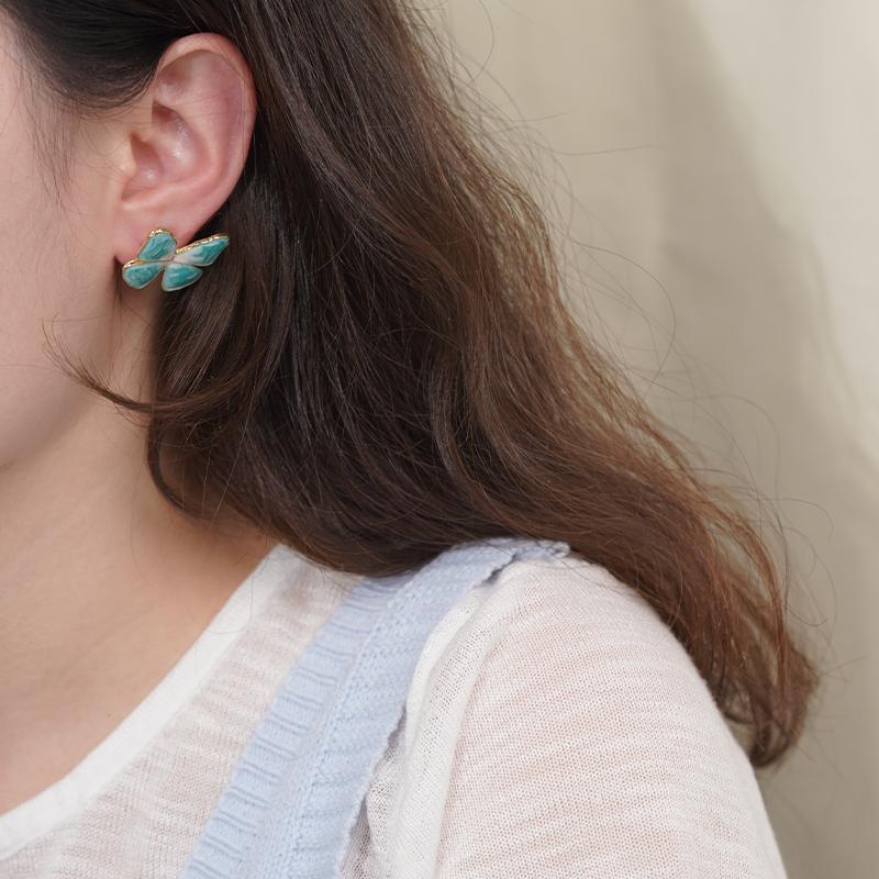 【Stud Earrings】Gold-Trimmed Enamel Blue-White Gradient Butterfly Studs, Ink-Wash Texture Dainty Earrings for Women