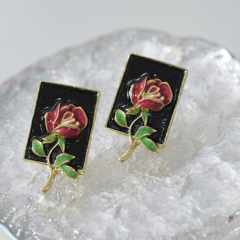 【Stud Earrings】Gold-Trimmed Enamel Red Rose Square Studs, Black-Gold Court-Style for Women