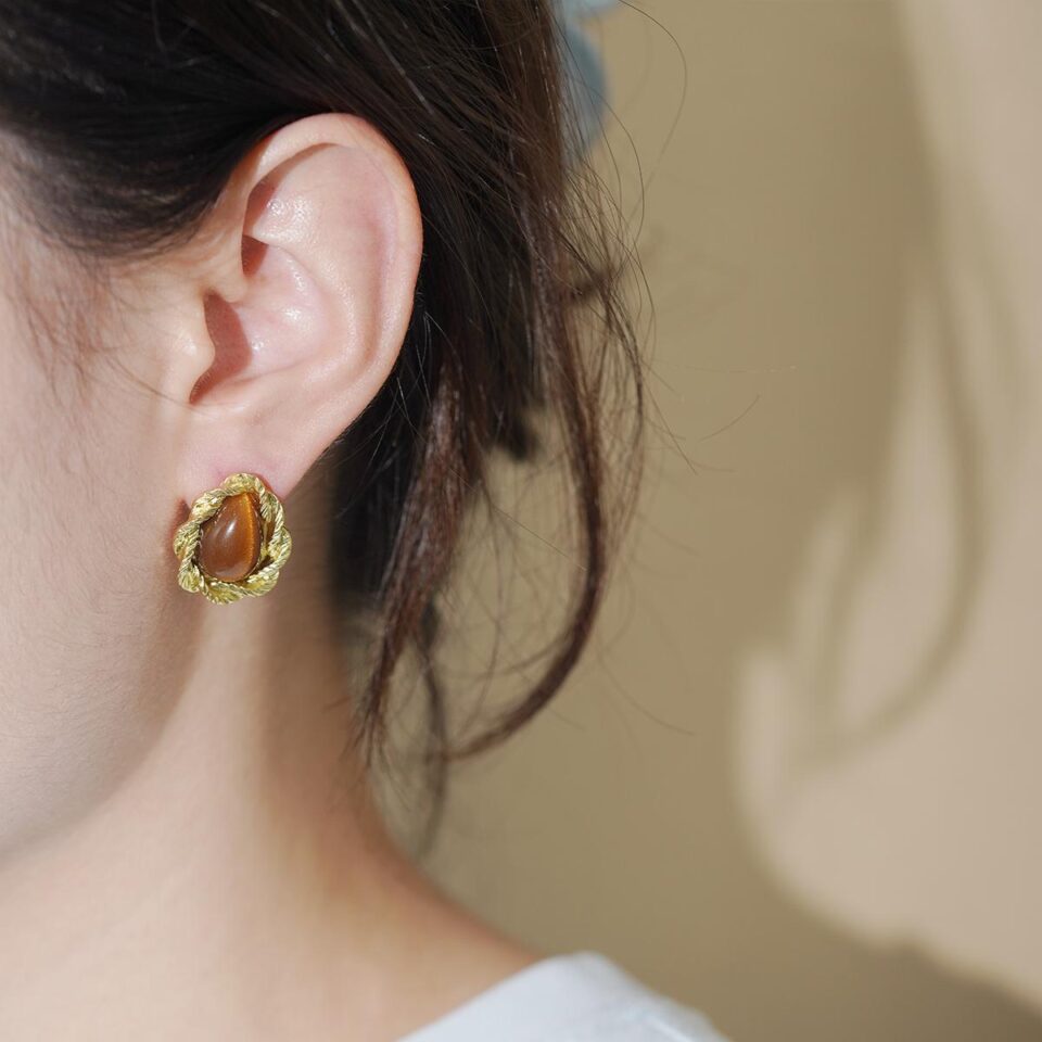 【Stud Earrings】Golden Rope-Textured Frame Studs with Brown Gemstones, Vintage Style
