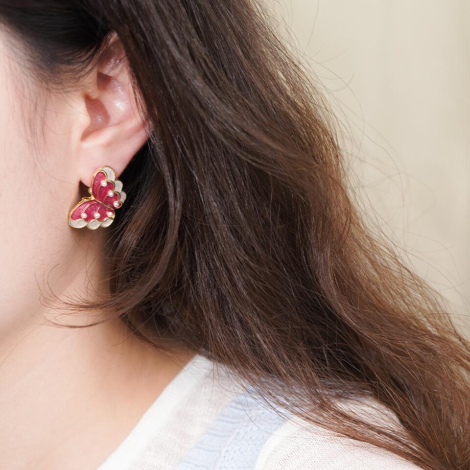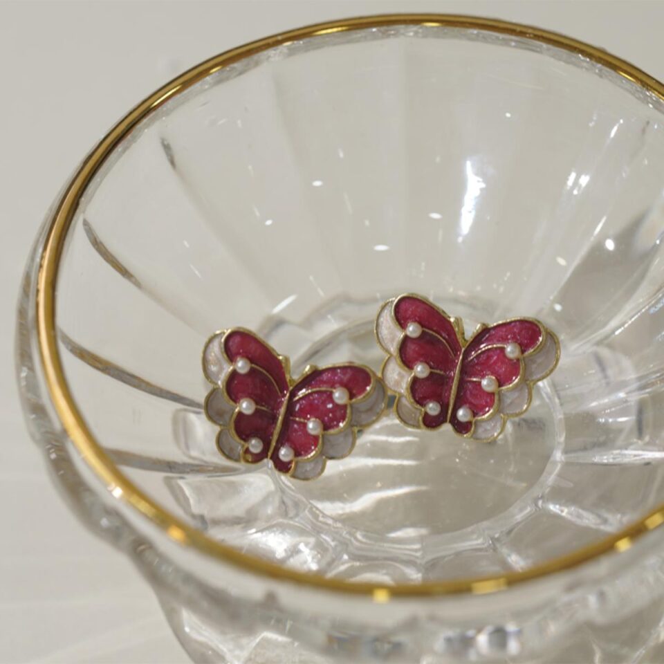 【Stud Earrings】Gold-Edged Red-White Layered Enamel Butterfly Studs,Vintage Style