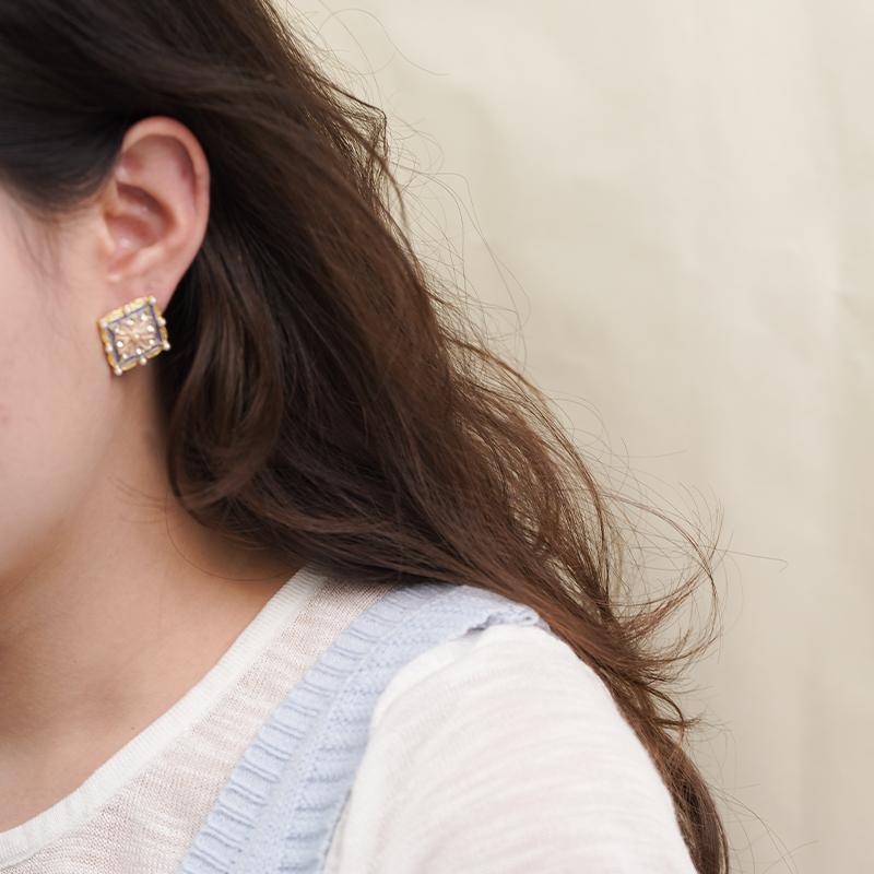 【Stud Earrings】Gold-Tone Square Vintage Floral Studs Imitation Pearls & Zircons, Pink-Purple-Gold Court-Style Elegance for Women