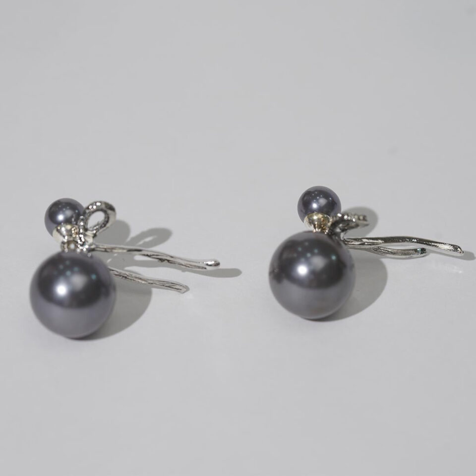 【Stud Earrings】Gray Faux Pearls & Zircon-Encrusted Bow, Vintage-Chic Design for Daily Style