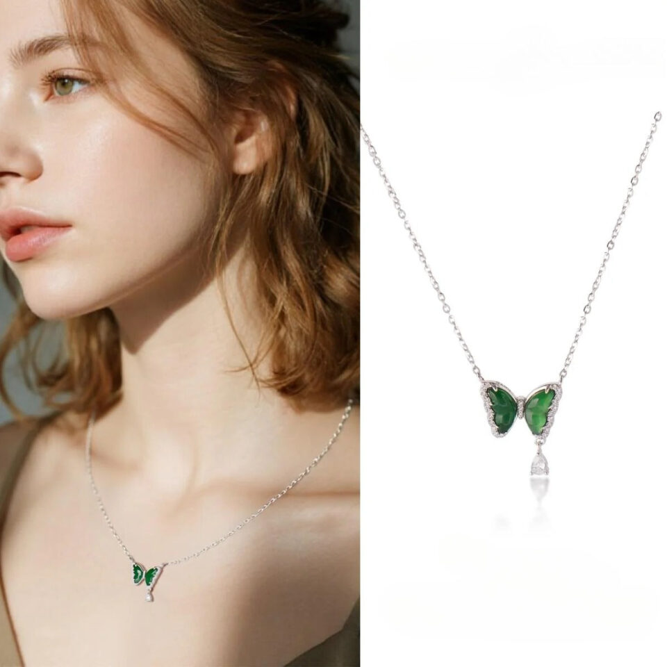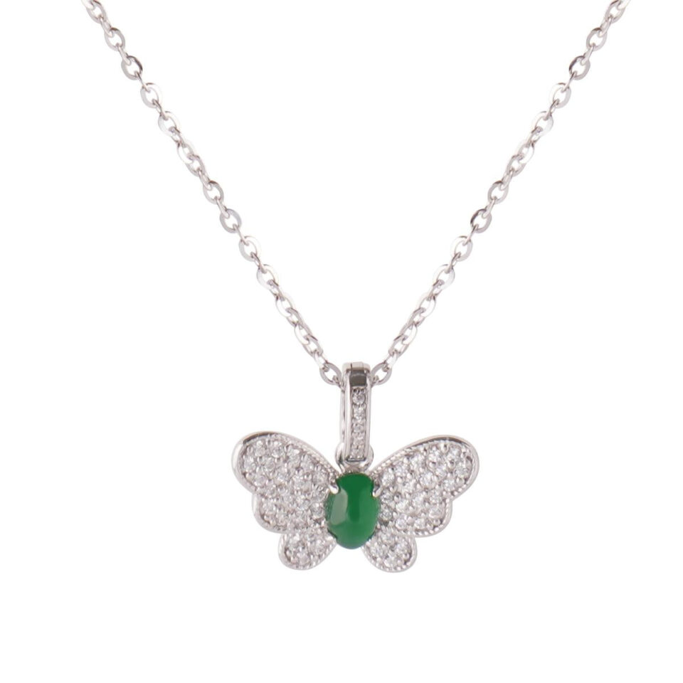 【Pendant Necklace】Butterfly-shape Jadeite Pendant with Silver-made Chain Necklace, Shining Zircon, Elegant Jadeite Jewelry Pendant Necklace for Women