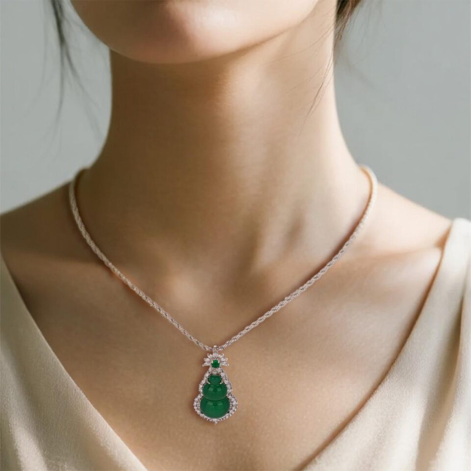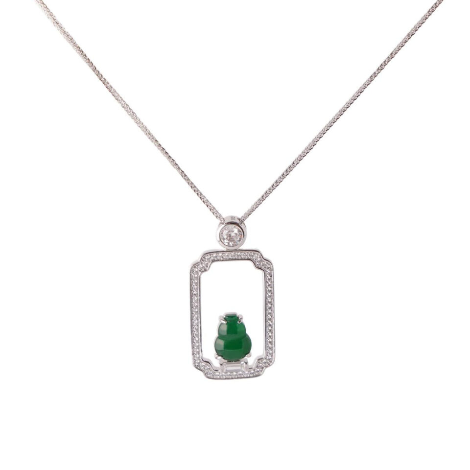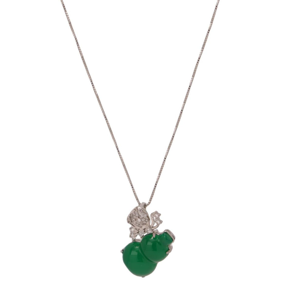 【Pendant Necklace】Green Chalcedony Gourd Pendant Necklace with Alloy Frame & Zircon Accents fashion Jewelry gift for women Fortune Blessing