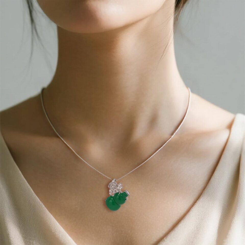 【Pendant Necklace】Green Chalcedony Gourd Pendant Necklace with Alloy Accents & Zircon Elegant Daily Lucky Charm Jewelry Gift for Women