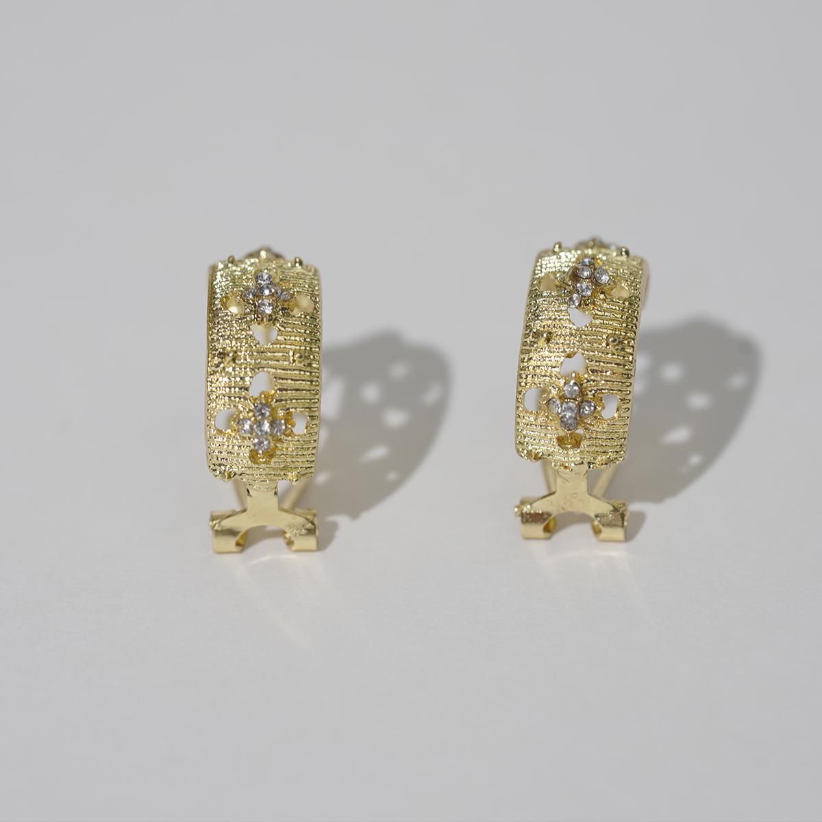 Crafted from copper alloy with a gold-colored finish, these half-hoop ear cuffs feature a brushed texture that adds vintage charm. Intricate clover motifs and tiny cubic zirconia inlays bring delicate sparkle to the design. The hoop clasp ensures easy, secure wear.