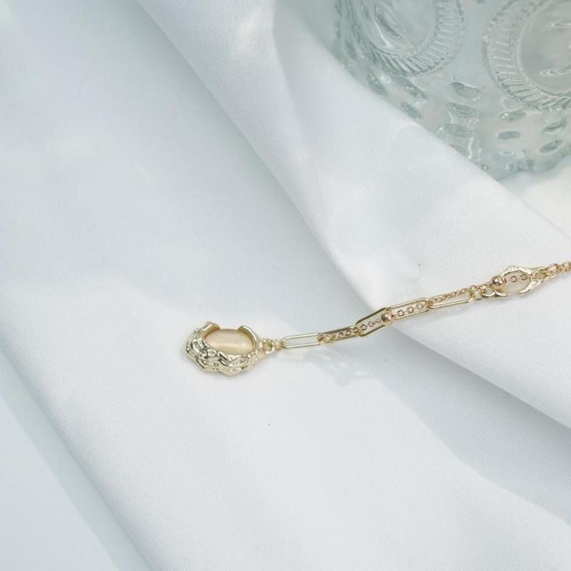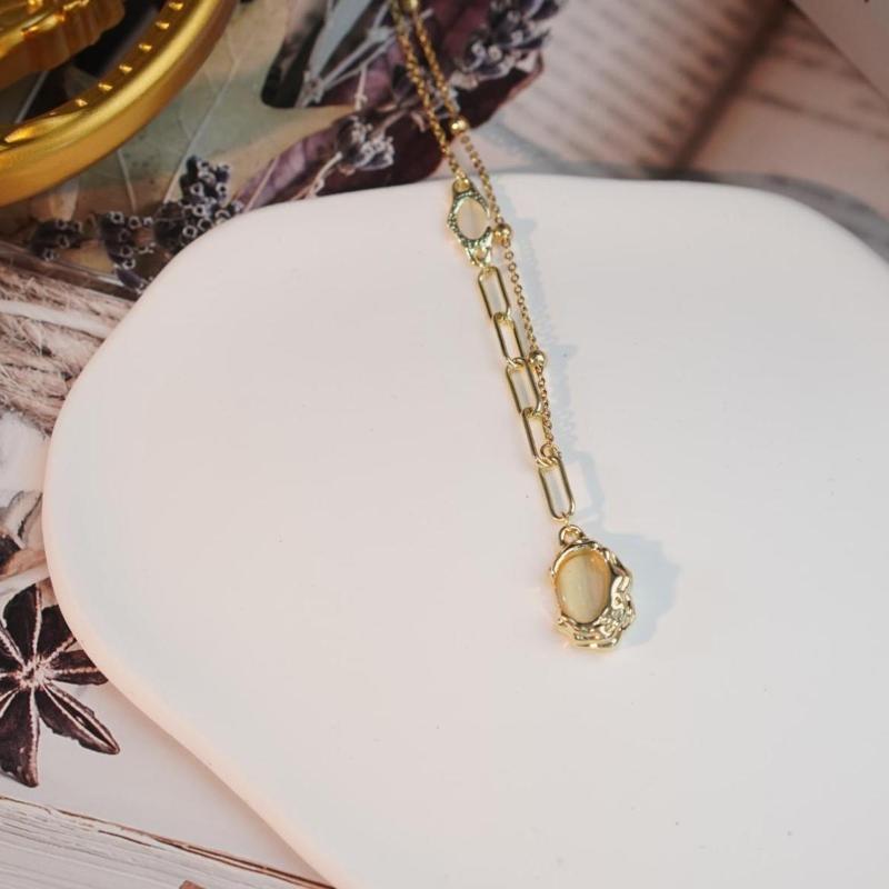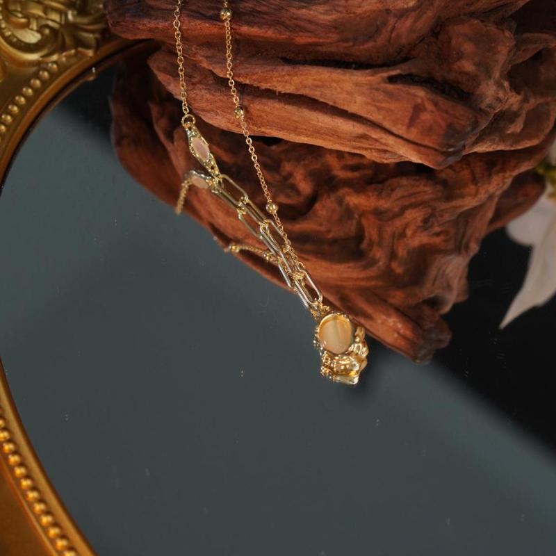 This distinctive necklace showcases an oval cat’s eye stone suspended in an artisan-crafted metal frame with vintage floral engraving. The asymmetrical chain design combines rectangular links on one side with delicate bead chains on the other, merging structural contrast with visual harmony.