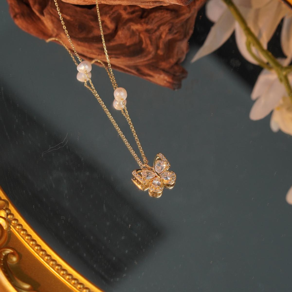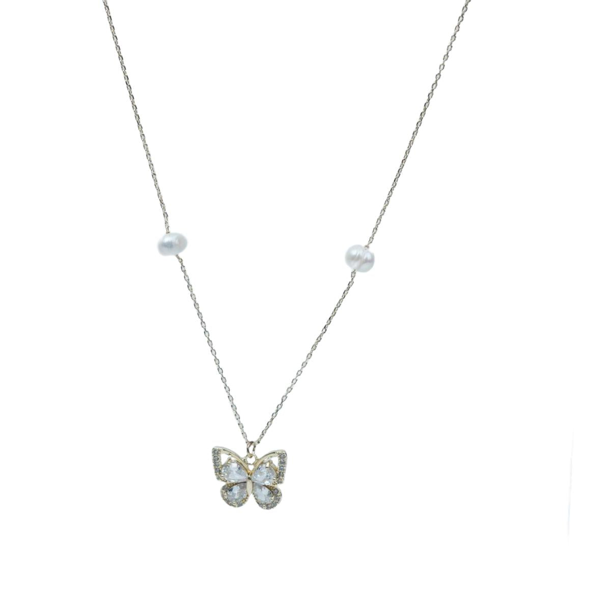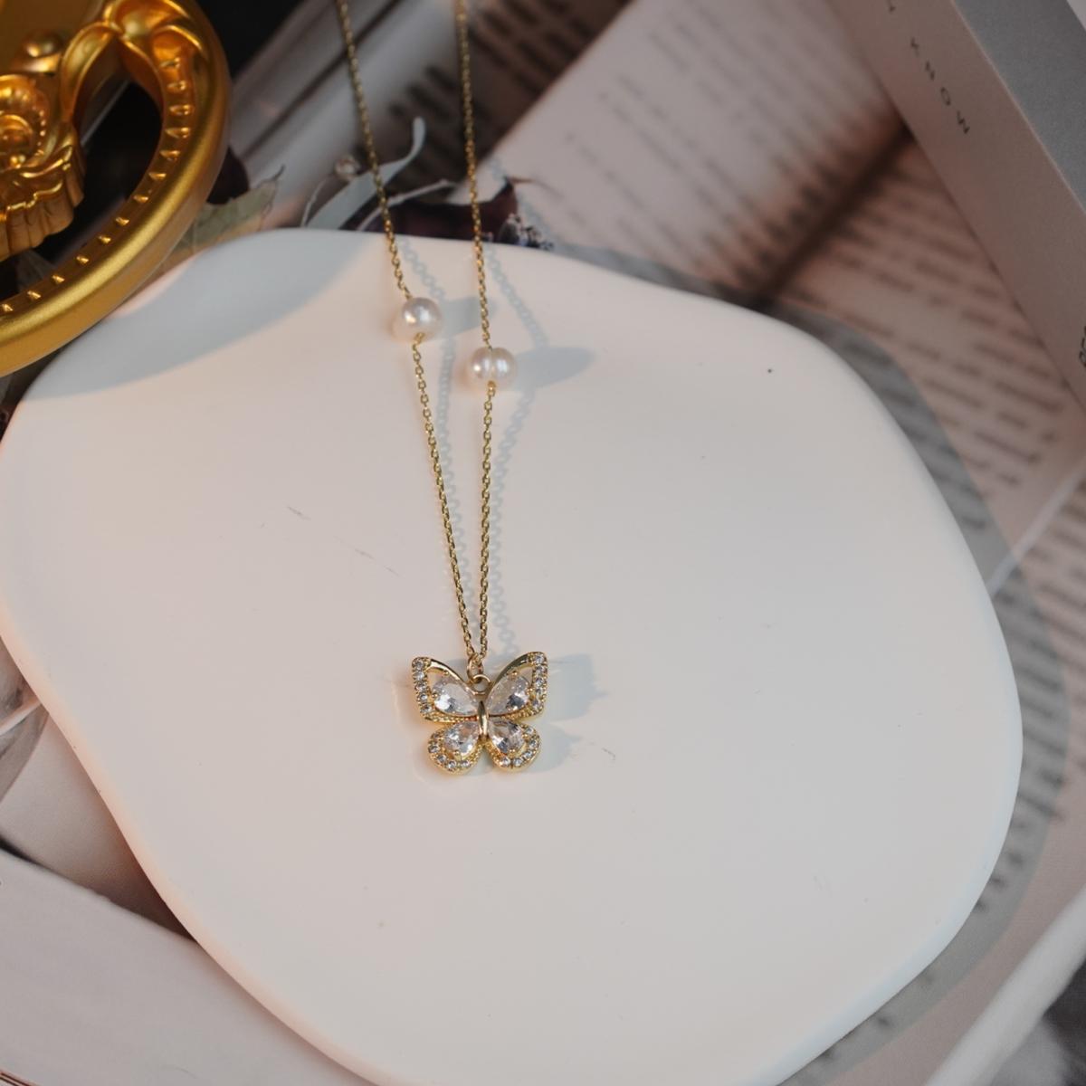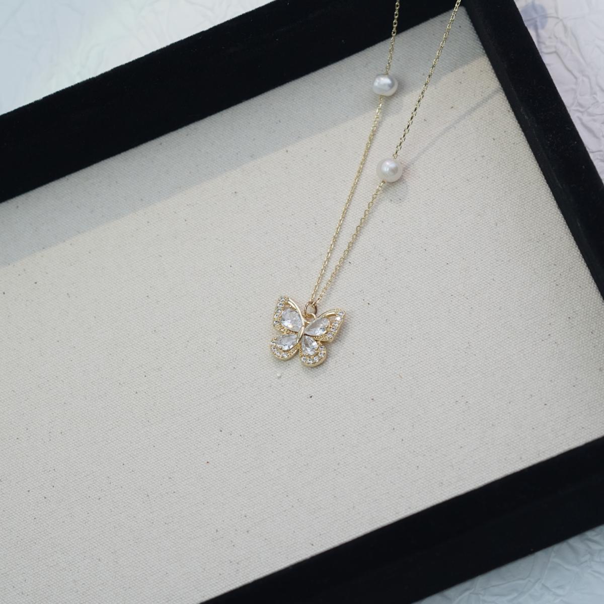 This enchanting necklace combines delicate freshwater pearls with a dazzling butterfly pendant. The graceful design transitions from pearl purity to zircon brilliance, creating a perfect balance of elegance and sparkle.