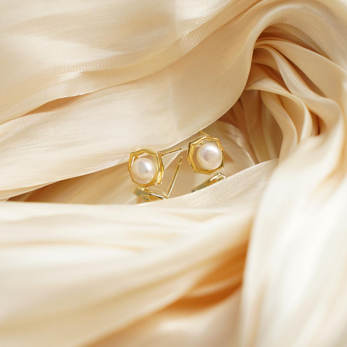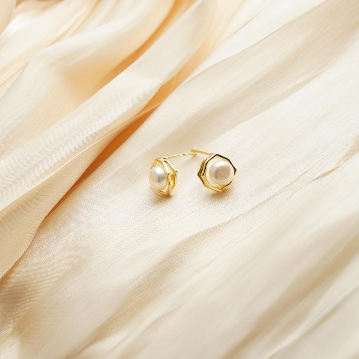 The earrings feature a round white natural freshwater pearl at the center, which emits a soft, creamy luster with a delicate and warm texture. The pearl is encased in a geometric frame crafted from golden alloy, featuring an irregular polygonal outline with undulating edges and a texture reminiscent of polished pebbles, resulting in fluid lines and a modern aesthetic. The metal component radiates a warm, bright golden glow that complements the pearl’s natural hue, highlighting the harmony and beauty between the materials. The ear pins are made of silver, ensuring comfortable and secure wear.