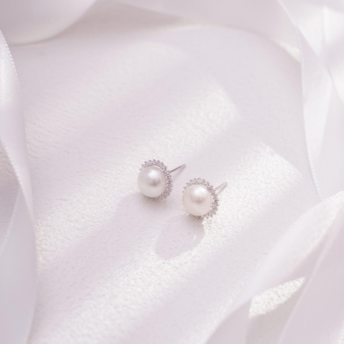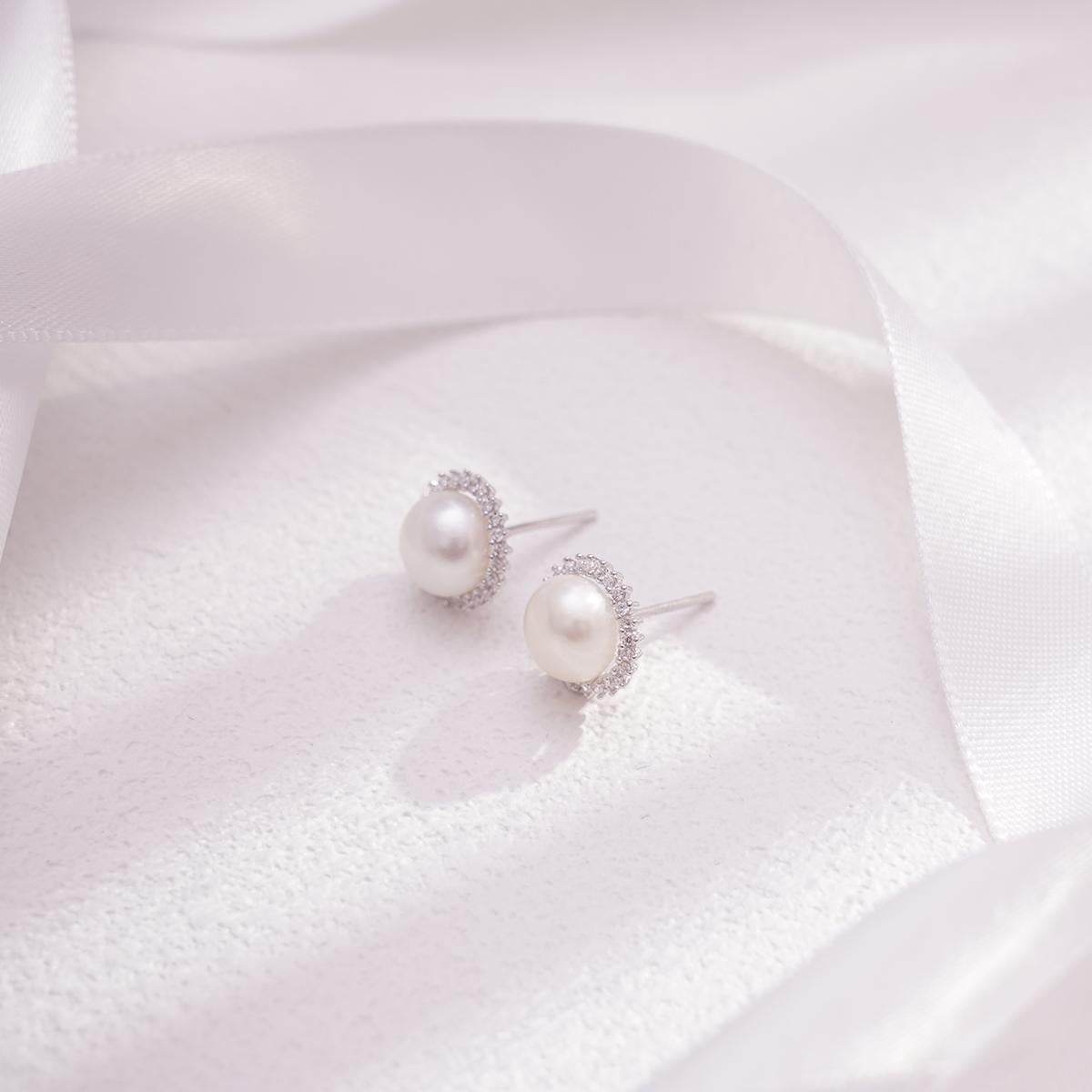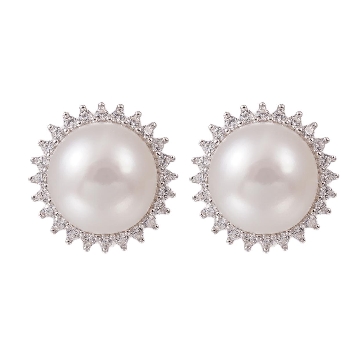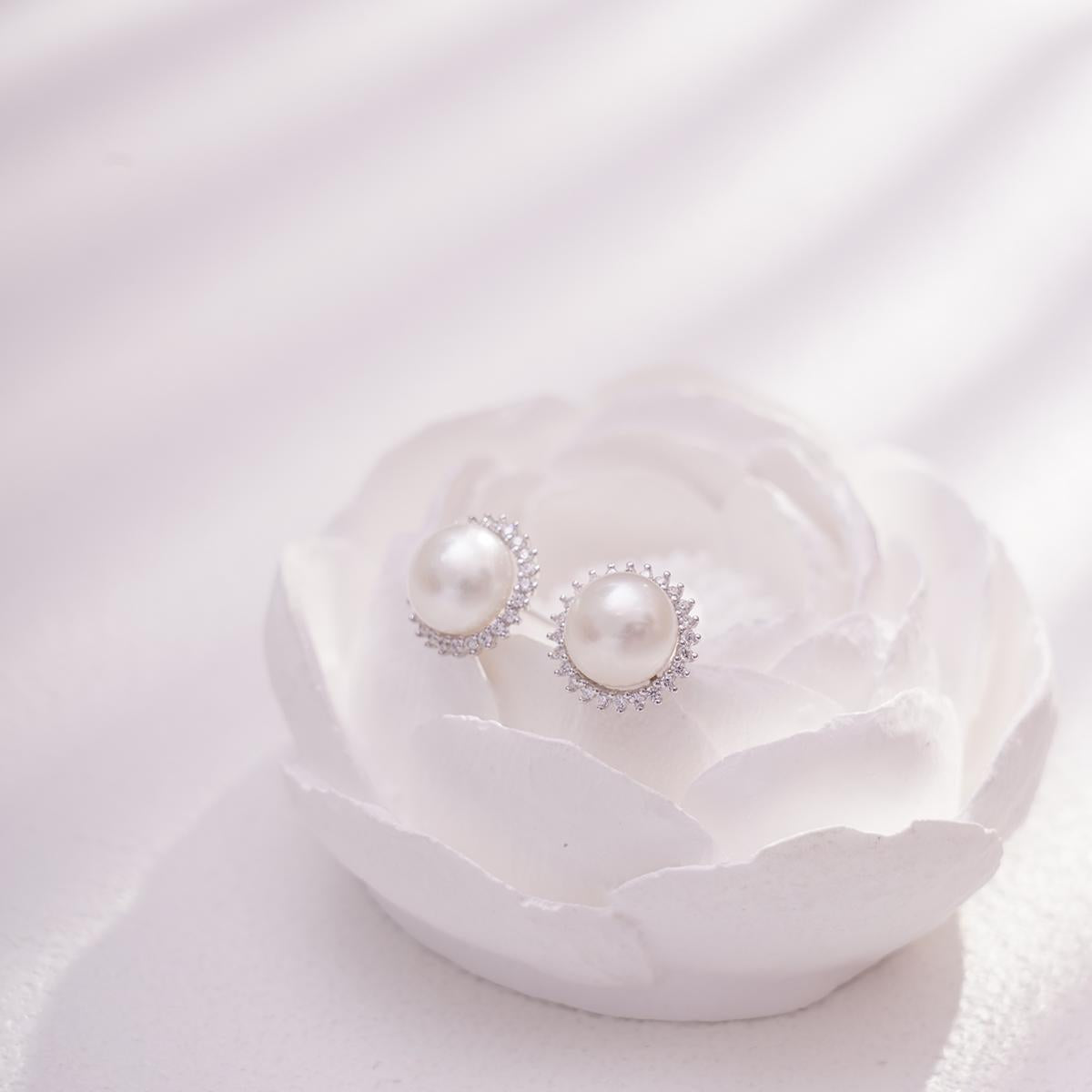 Centered with a smooth, naturally luminous white freshwater pearl, these stud earrings showcase a soft and warm glow. The pearl is encircled by a radiating arrangement of finely set silver-toned zirconia stones, each pave-set to reflect bright, sparkling light. The silver-base metal provides a clean and polished background, seamlessly connecting the organic pearl and the precise zirconia accents for a harmonious contrast in textures.