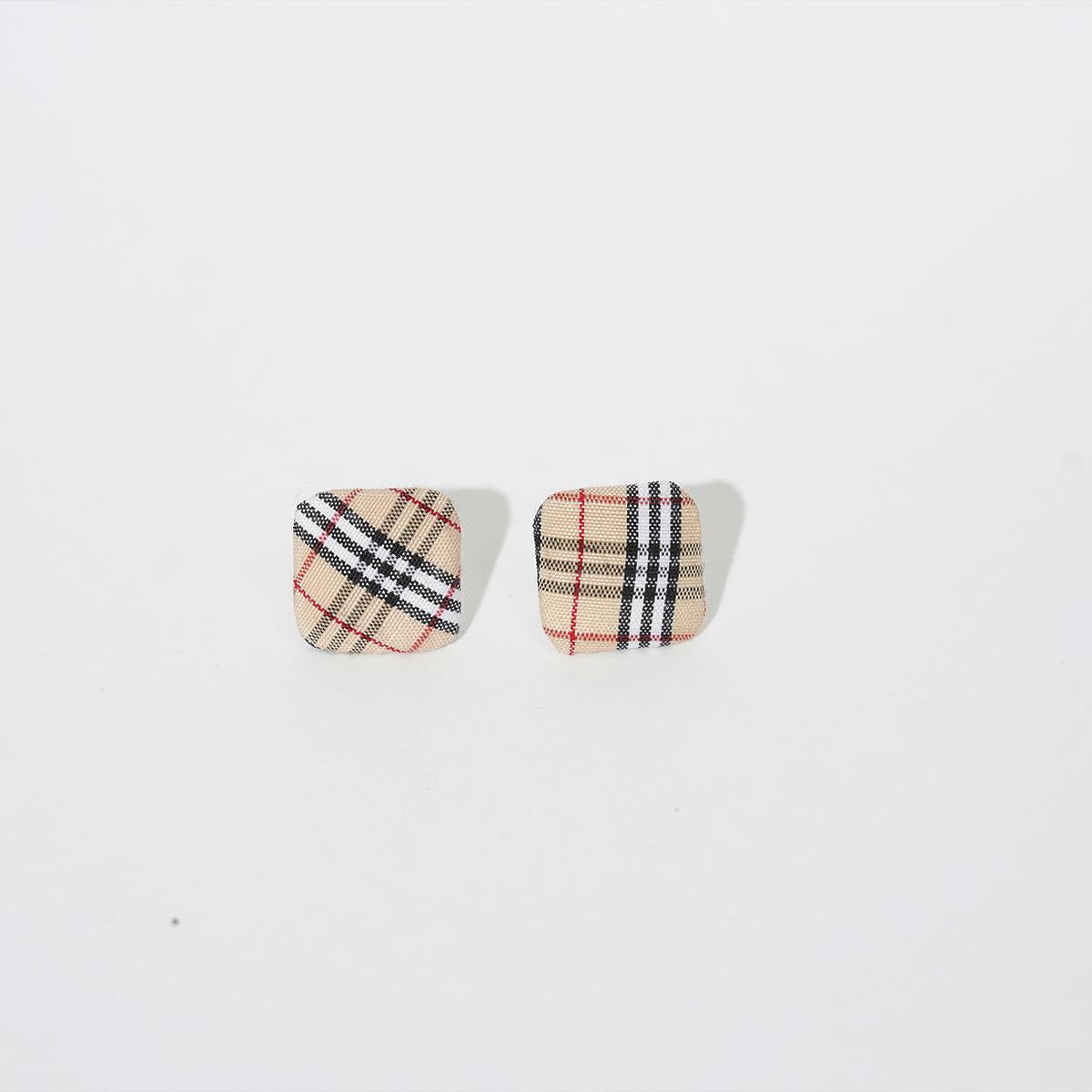 These earrings feature a square shape wrapped in classic plaid fabric. The beige base with black, white, and red lines creates a timeless British retro aesthetic. The fabric is neatly tailored around the square, with exquisite edge craftsmanship, blending vintage charm with minimalist design.