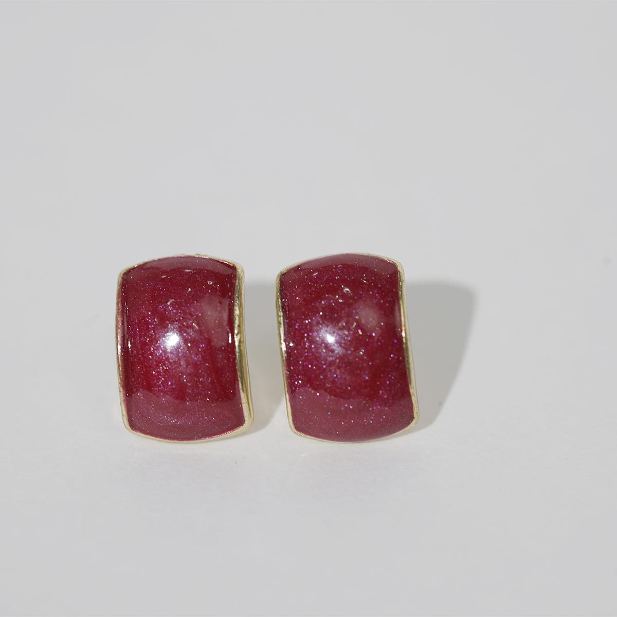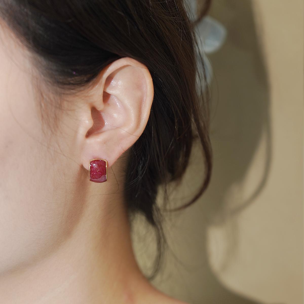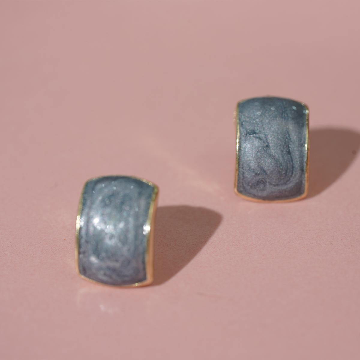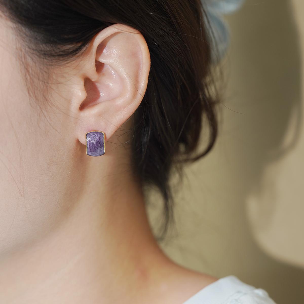 These stud earrings feature a rounded square glittery resin center framed by a delicate alloy border. The resin, available in four alluring shades — purple, red, white, and blue-gray — is infused with fine glitter particles that catch light beautifully, creating a subtle yet enchanting glow. The alloy edge adds a refined metallic contrast to the resin’s soft, shimmering texture.