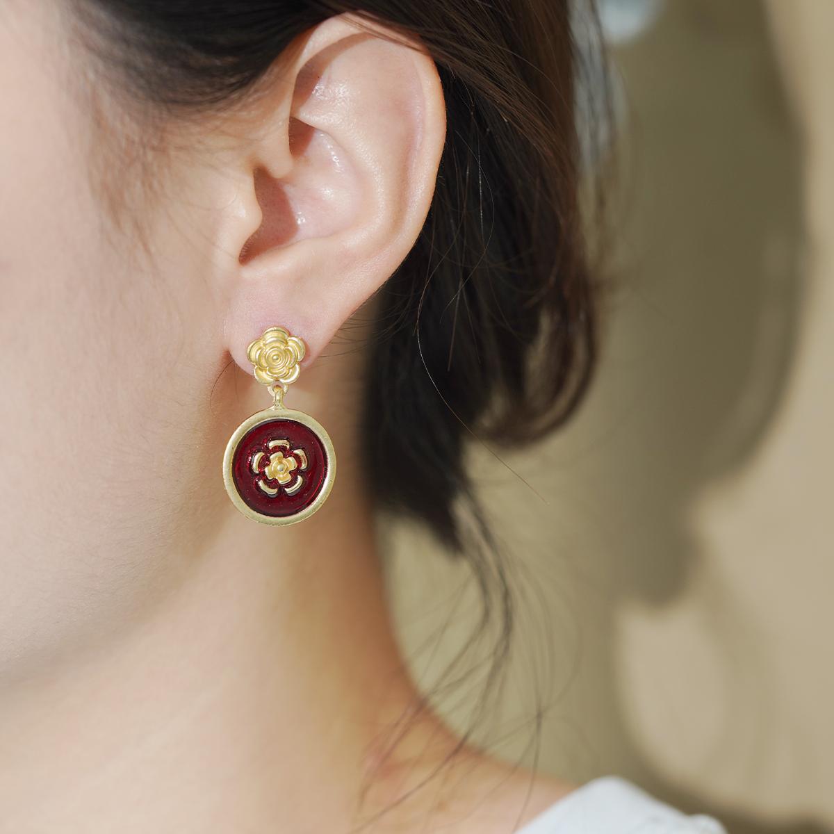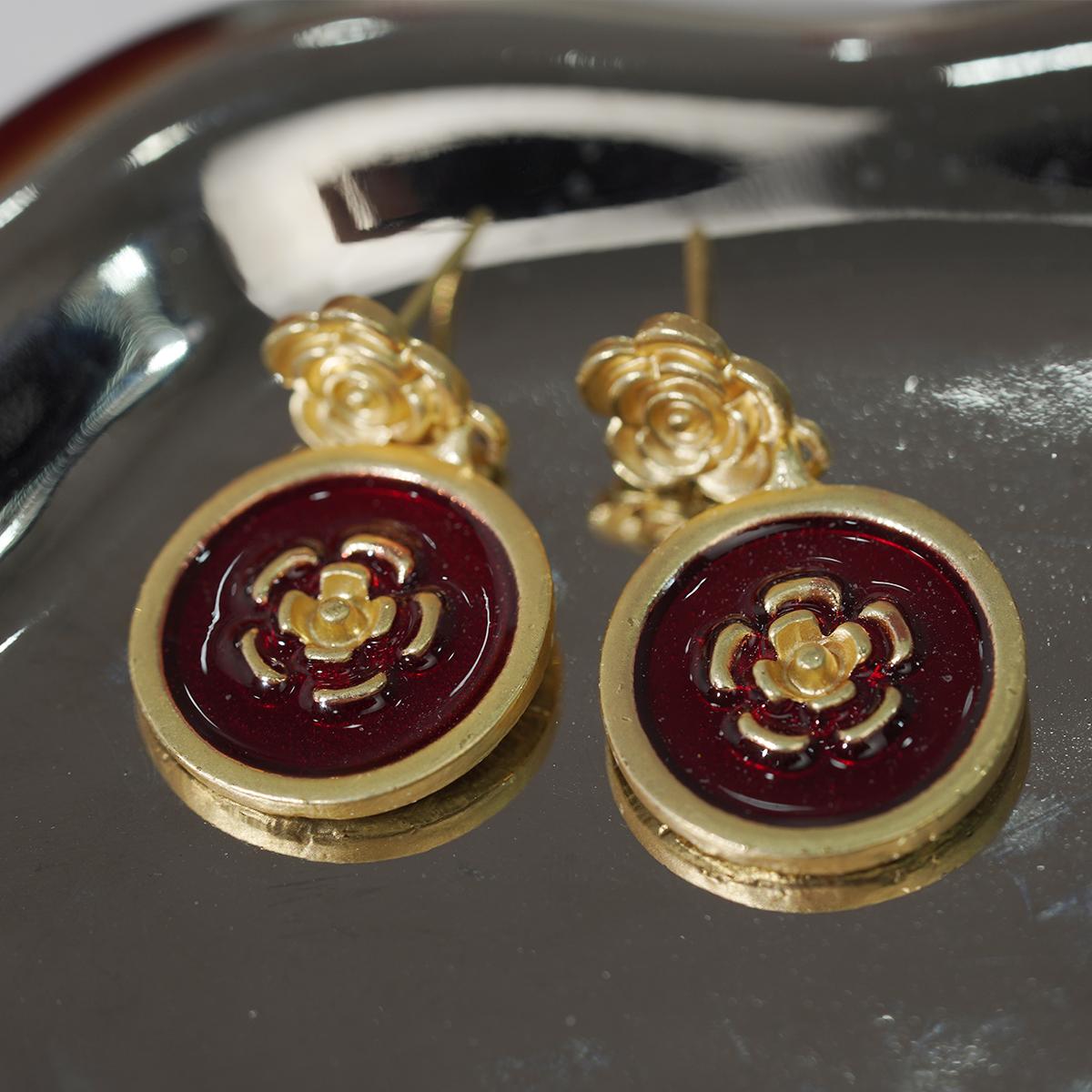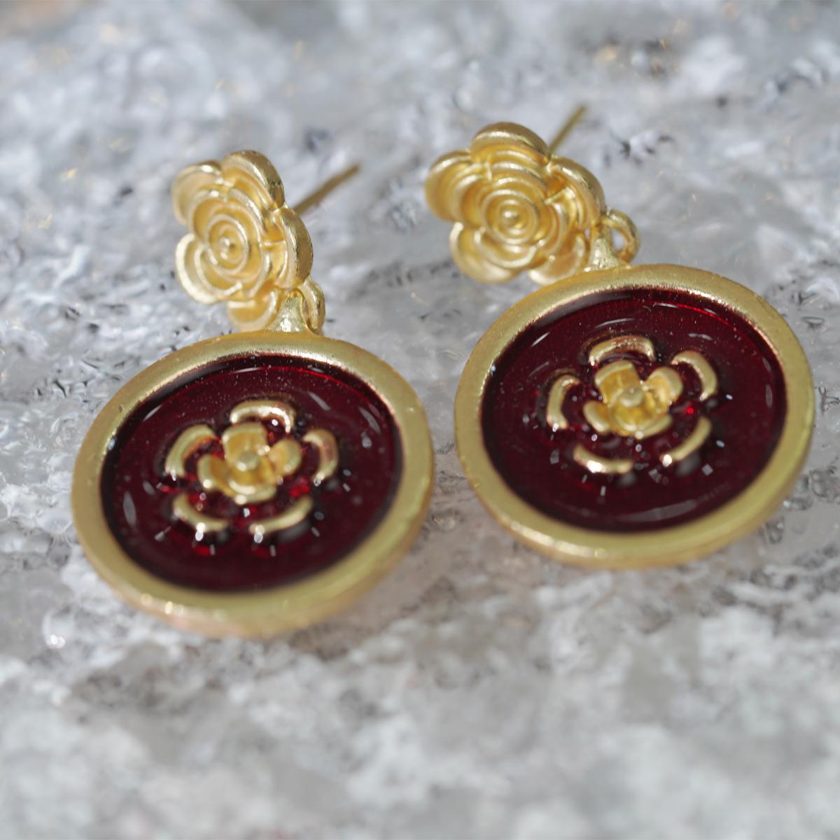 【Drop Earrings】Golden Flower & Wine-Red Enamel Round with Vintage Floral Design