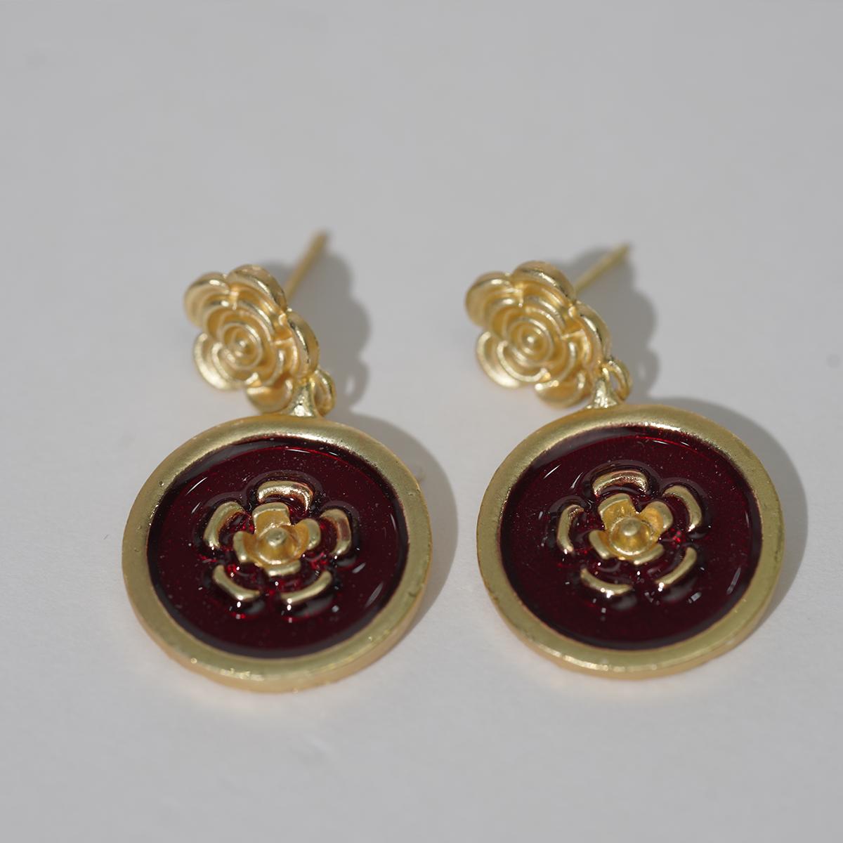These drop earrings feature a gold-alloy base, with a textured gold flower at the top and a round dangle below. The dangle showcases a wine-red enamel base (crafted via dripping-oil technique) with a central gold floral motif, framed by a gold trim for refined contrast.