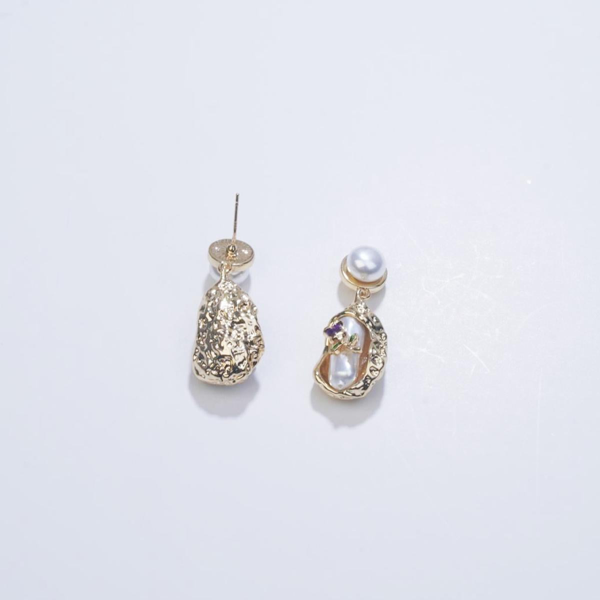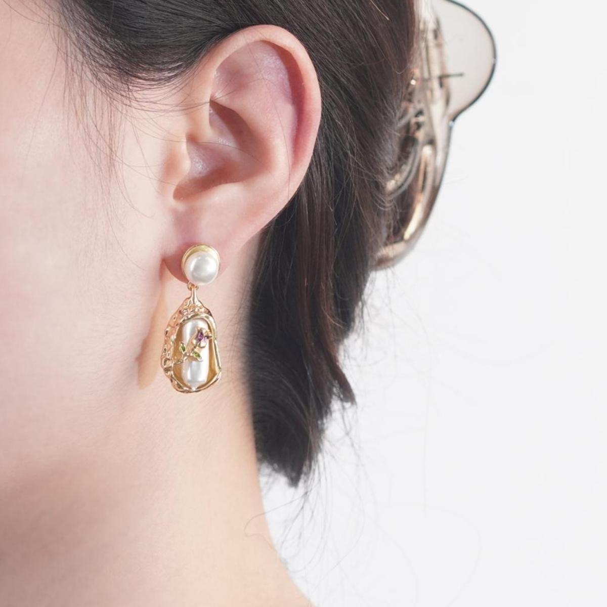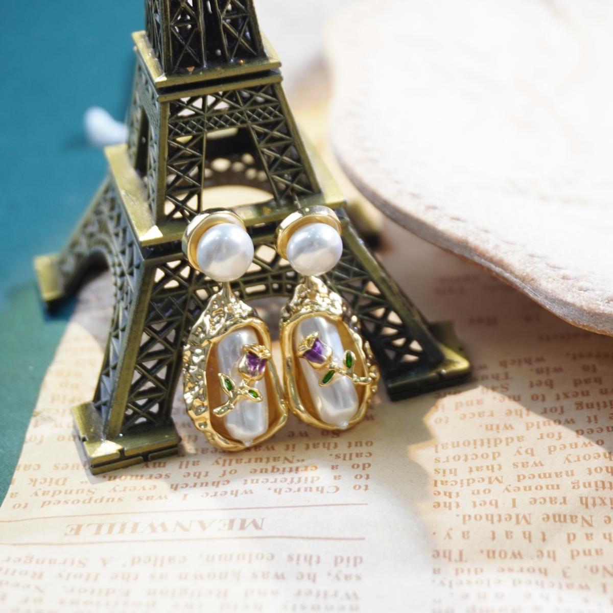 Design & Materials: These are Baroque-style pearl earrings. They combine alloy with pearls. The top has round pearls for a gentle touch. Below, pearls and purple roses are inlaid. The irregular metal frame mimics natural shell texture, showing exquisite design.