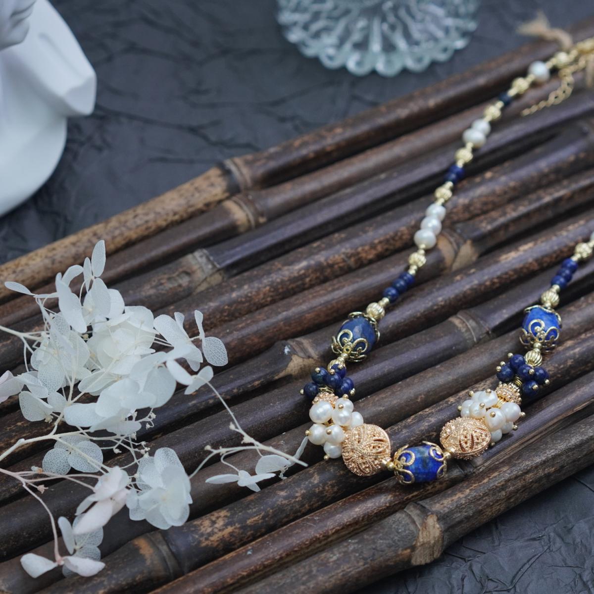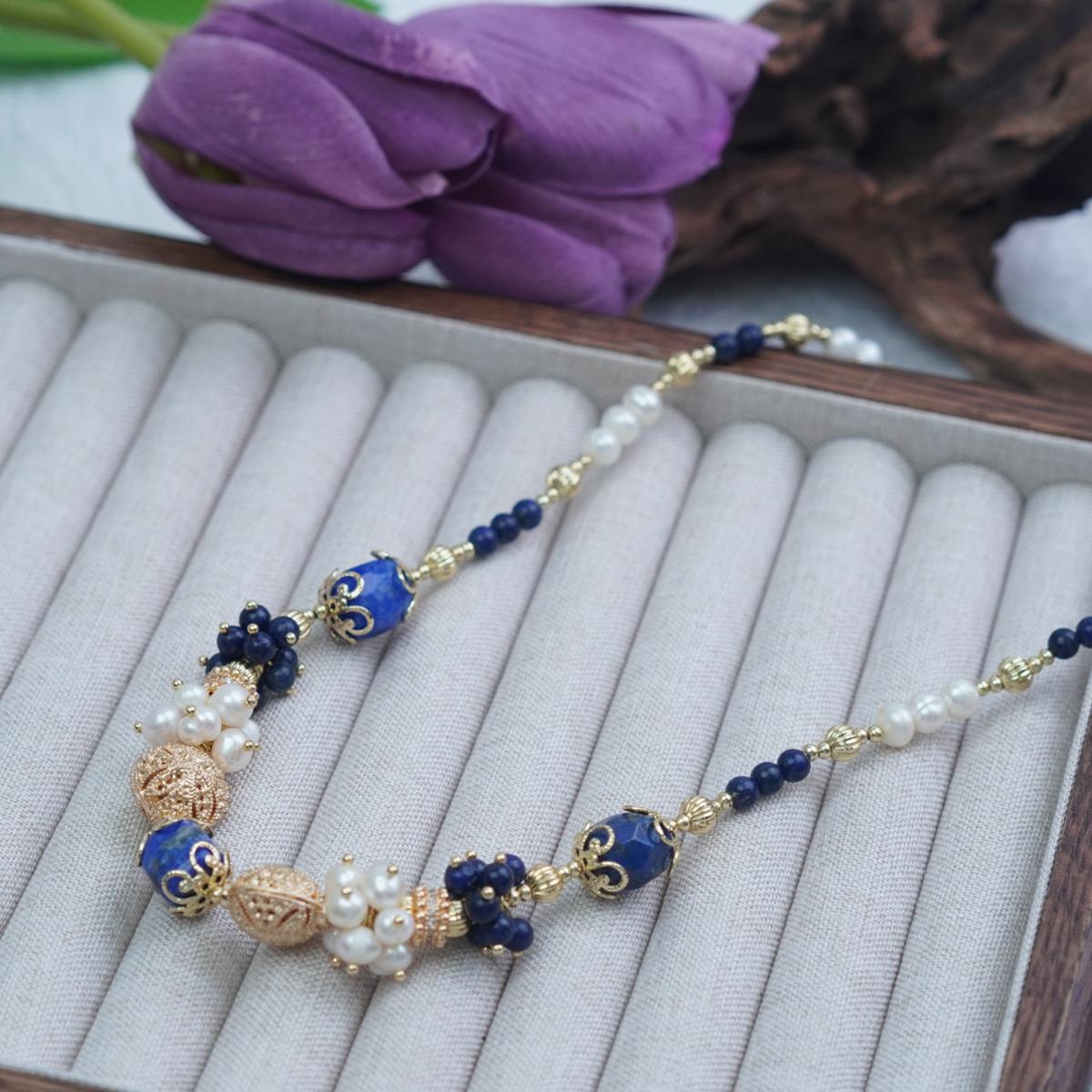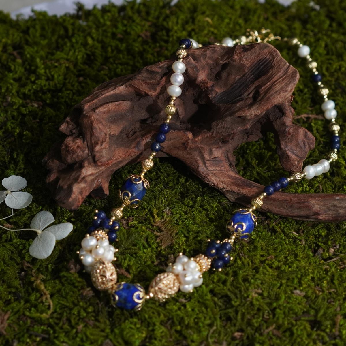 This set fuses lustrous pearls, deep – hued lapis lazuli, and 18K gold – plated copper. The necklace and earrings showcase a cohesive blue – and – white color palette, crafted with exquisite attention to detail. Each piece marries natural allure and metallic sophistication, forming a wearable work of art.