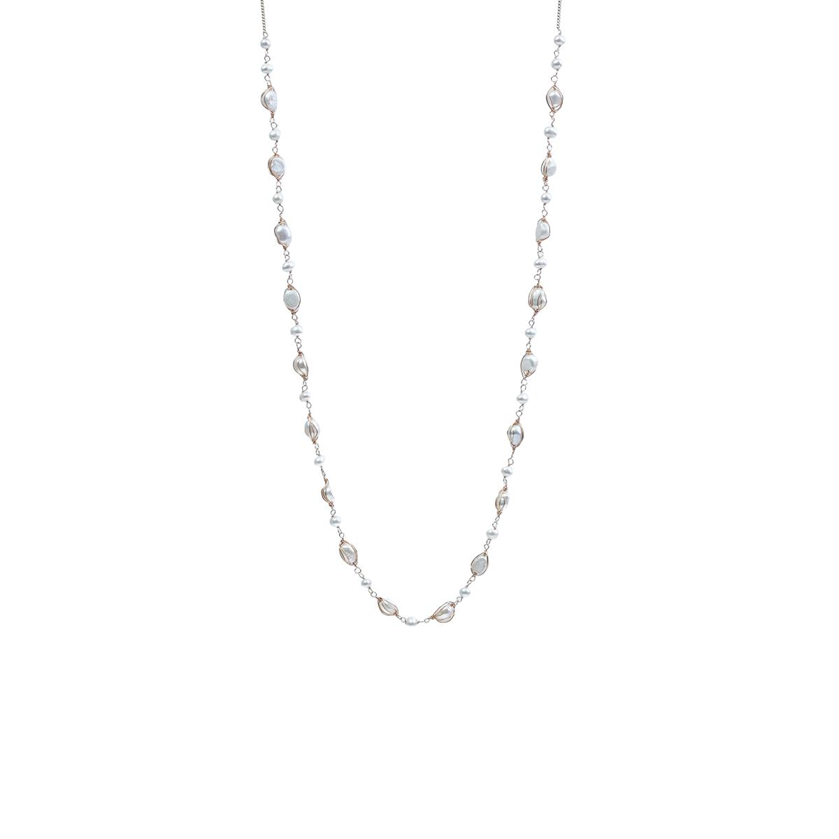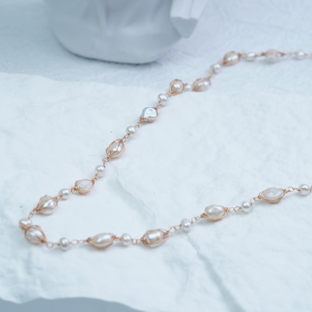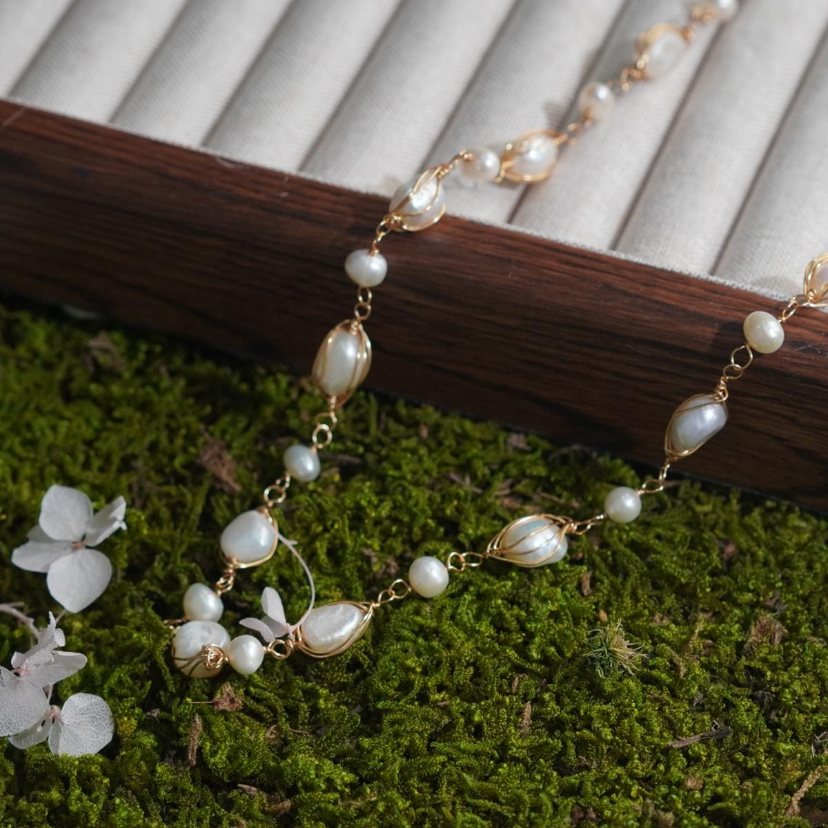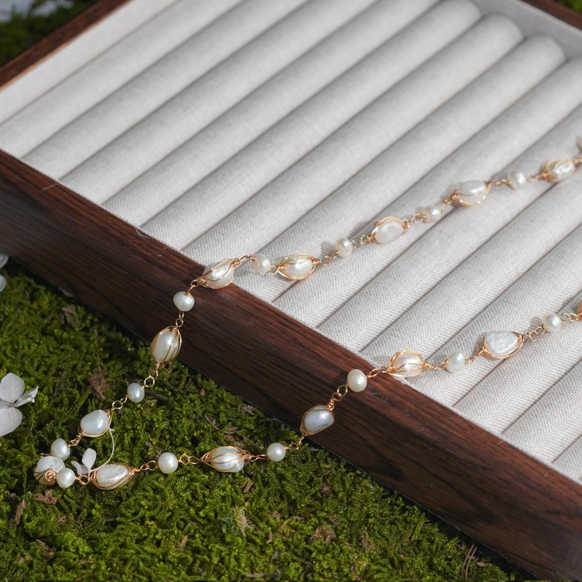 Crafted with natural freshwater pearls in diverse shapes, retaining unique textures. Combined with 18K gold – plated copper wire – wrapping technique, the necklace blends vintage allure and delicate craftsmanship. Each pearl is a natural wonder, making your piece one-of-a-kind.