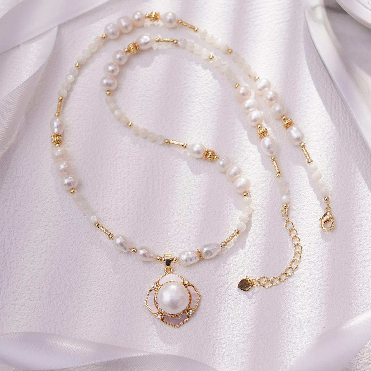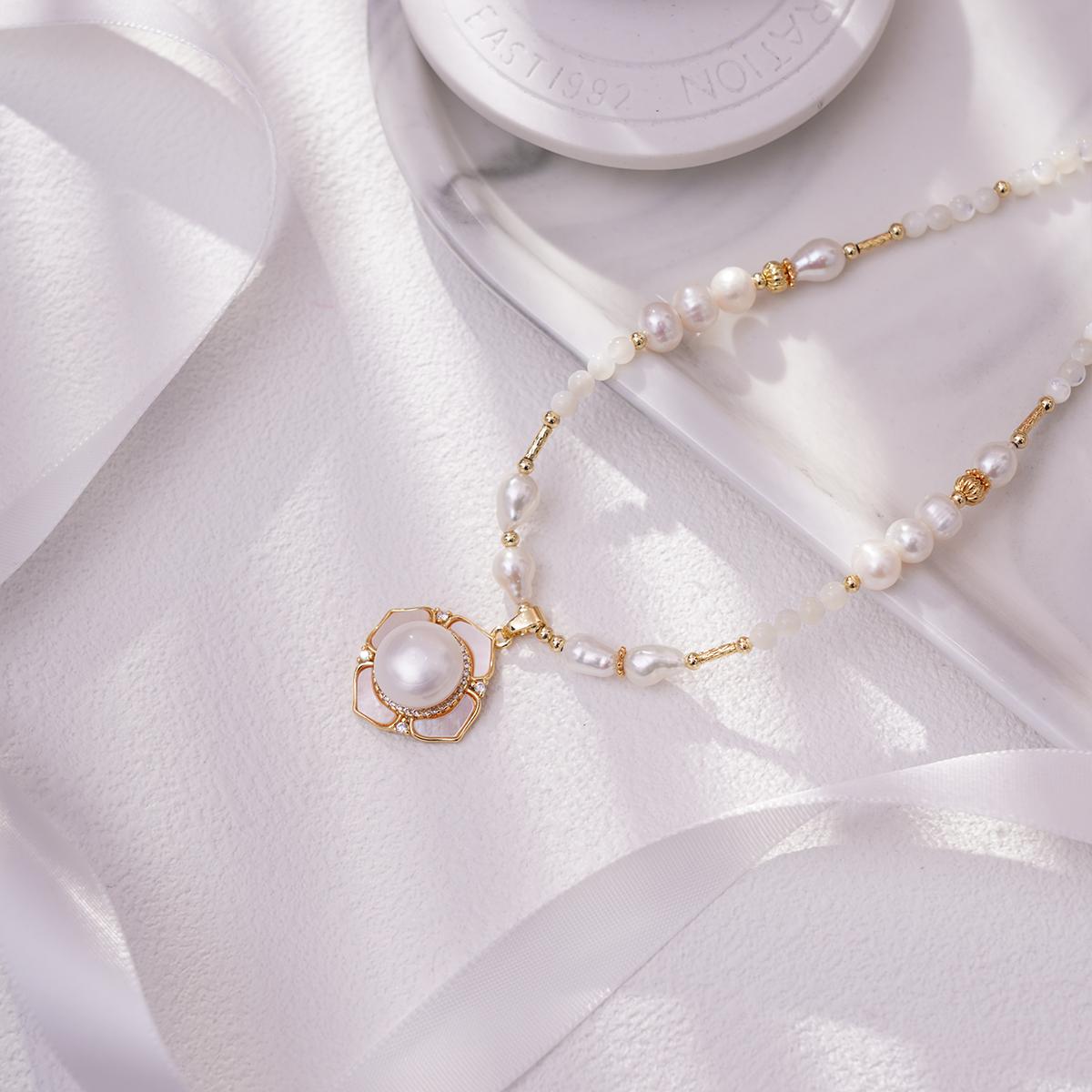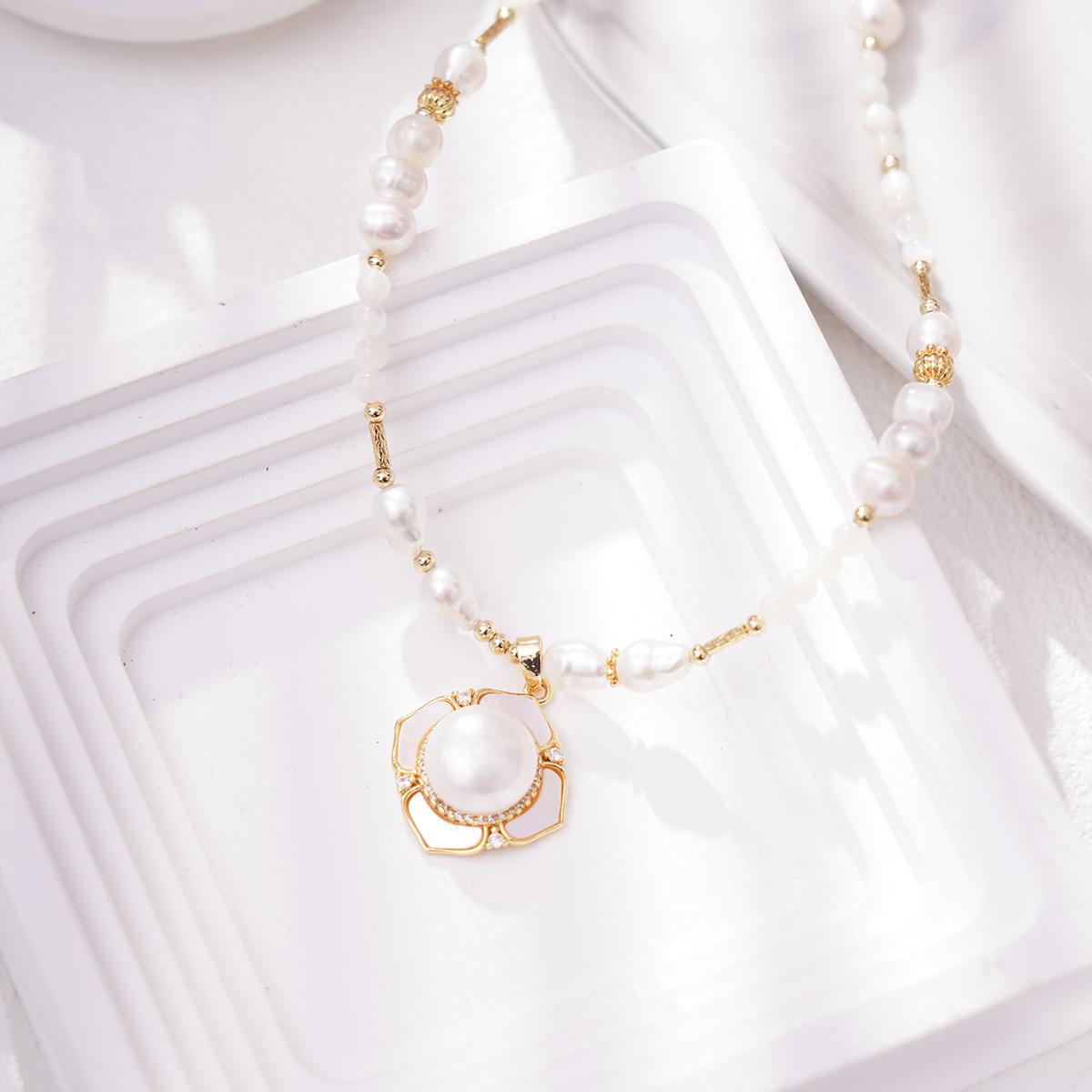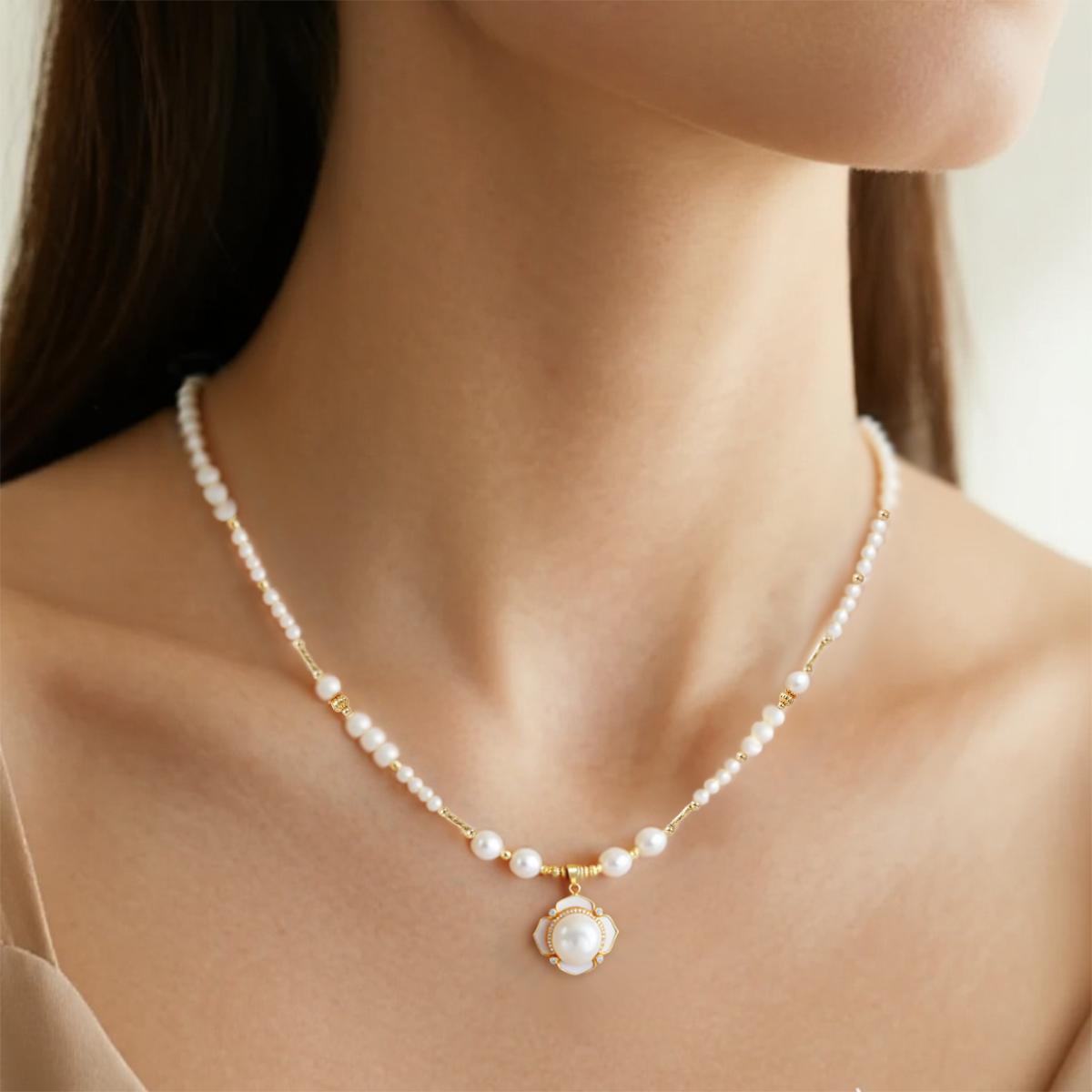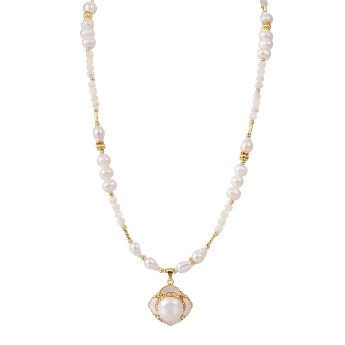 The brass chain exhibits a smooth finish with neatly connected links free of imperfections. Freshwater pearls showcase a soft, consistent luster with natural roundness. Shell elements retain their unique organic textures while being securely set. The geometric pendant maintains precise construction with zircon stones firmly placed and shell segments symmetrically aligned. The mixed materials create harmonious visual depth without compromising durability, ensuring lightweight comfort for extended wear.