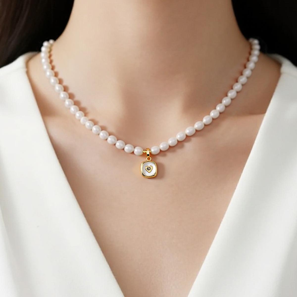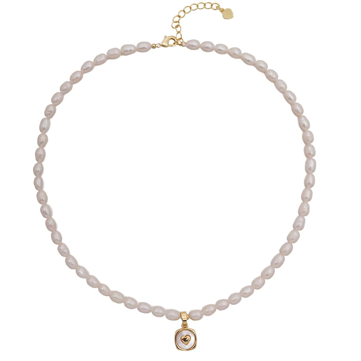 The necklace chain is crafted from pure brass with a warm gold-plated finish. Uniformly strung with plump, lustrous natural freshwater pearls that emit a soft iridescent glow, it features a centrally suspended square gold-toned pendant. This focal piece showcases an intricately carved three-dimensional heart motif with clear, layered detailing. The closure includes a gold-toned lobster clasp with an adjustable extender chain for versatile sizing, complemented by a delicate mini heart-shaped charm at the tail end, echoing the design theme.