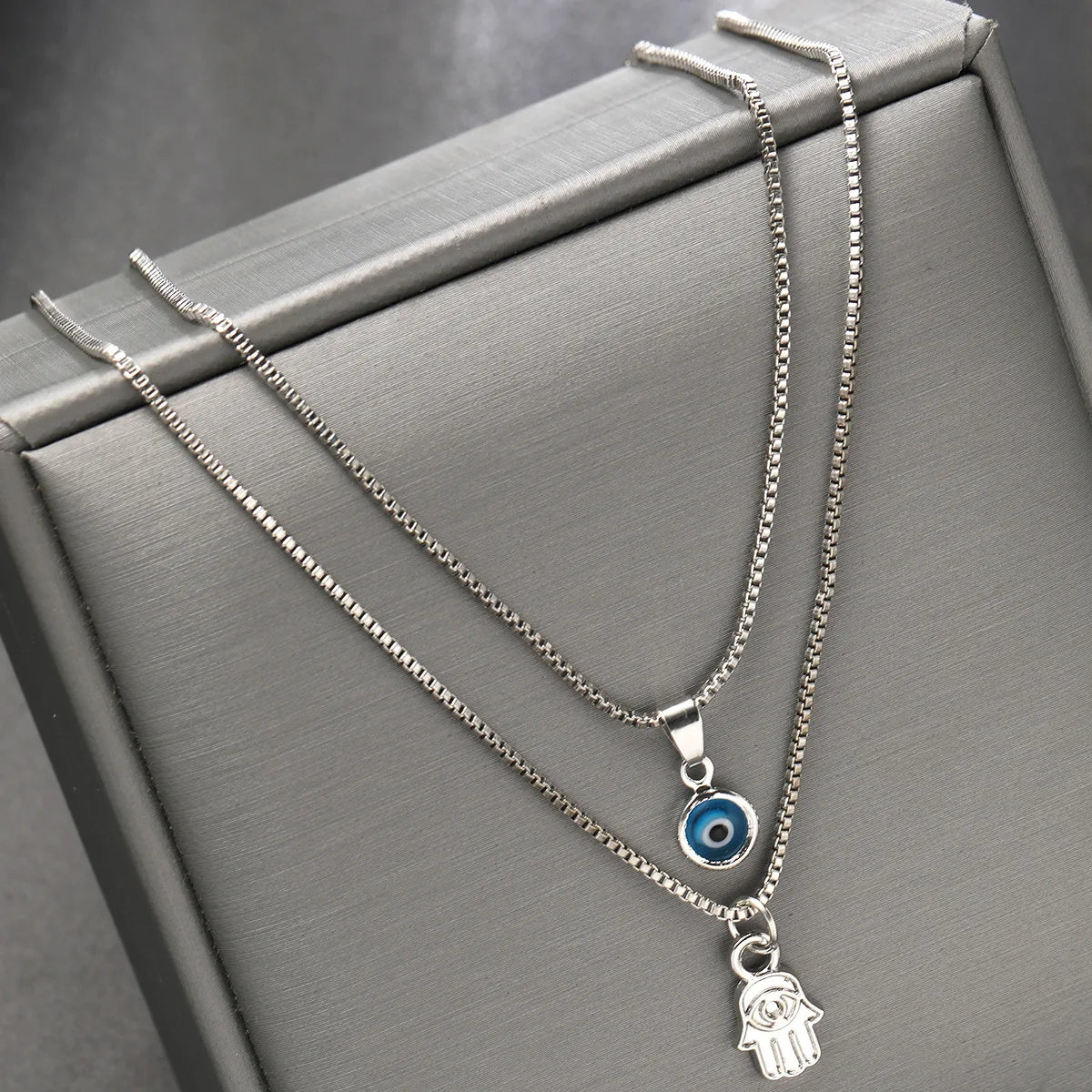 2 Pcs Double Layer Palm Evil Eye Clavicle Chains Necklace for Women Classic Fashion Turkish Lucky Blue Eye Choker Jewelry Gifts