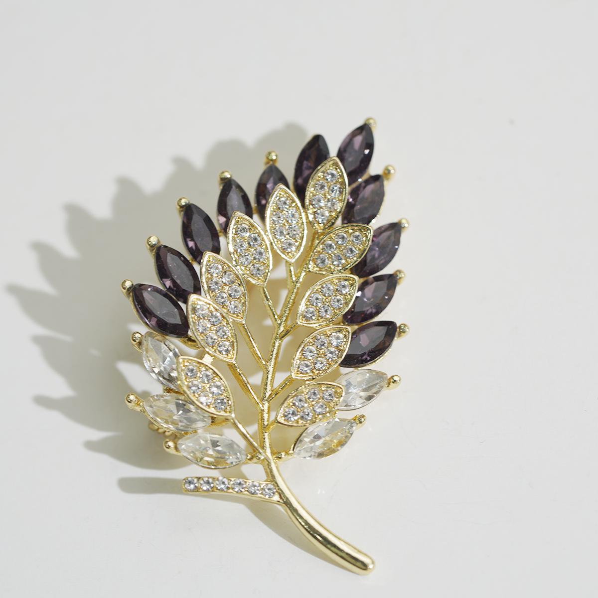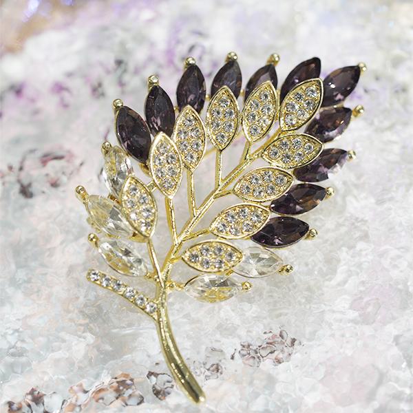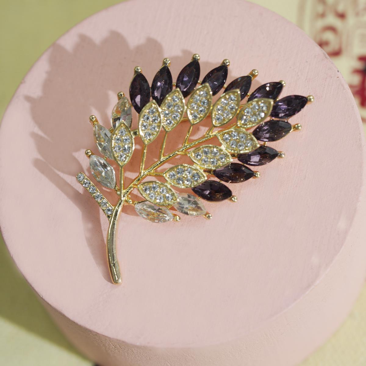 Botanical Crystal Brooch – Gold-Plated Vine, Purple & Clear Leaves, Elegant Statement for Style Lovers
