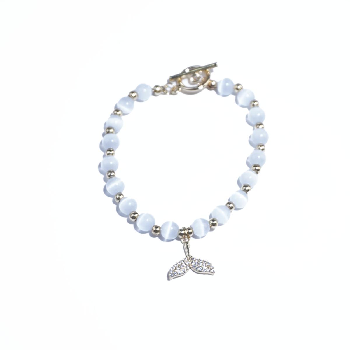 Luminous white cat’s eye beads shift silky rays with movement, connected by micro gold-tone spacers. Features a tiered fishtail pendant densely set with precision-cut simulated diamonds for waterfall-like sparkle. Elastic-free seamless loop.
