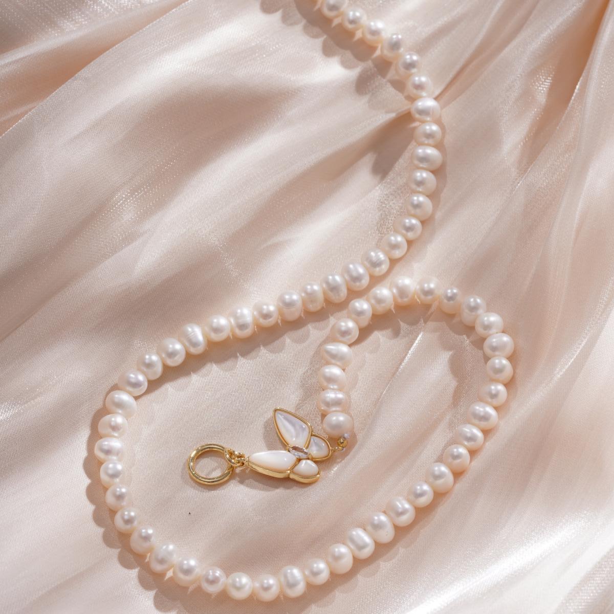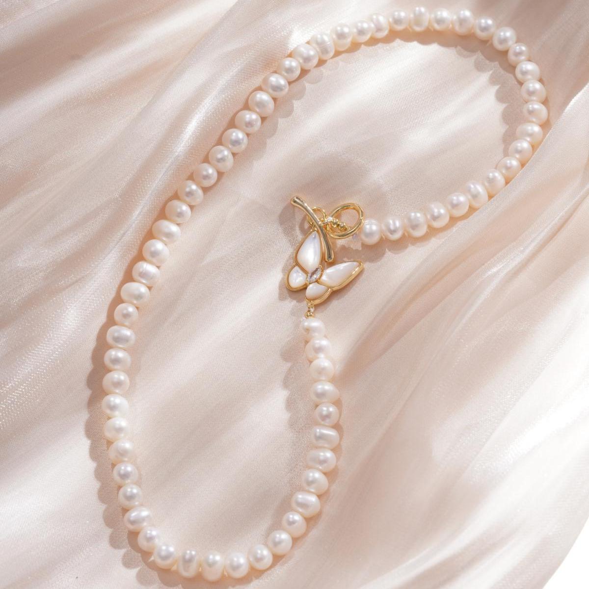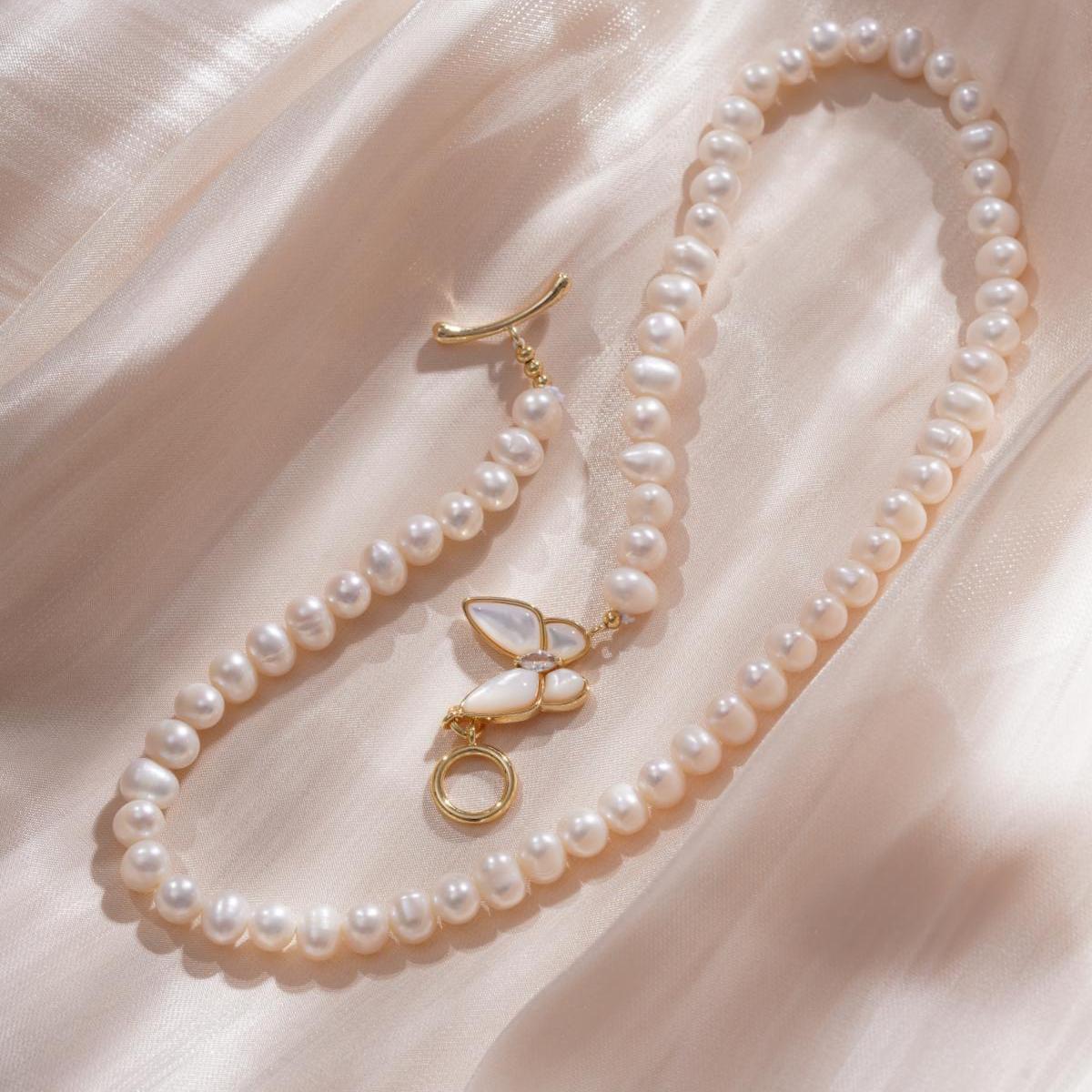 Crafted with meticulous care, this necklace features naturally beautiful freshwater pearls strung together to create a lustrous and refined surface with organic charm. The chain is thoughtfully made from hypoallergenic 925 sterling silver, offering a comfortable, irritation-free wearing experience that gently protects delicate skin. The design showcases an exquisite butterfly motif brought to life: its elegantly unfurled wings are artfully shaped by multiple freshwater pearls, forming fluid lines and a dynamic posture; the butterfly’s body is meticulously rendered as a single, dazzling zirconia stone, radiating brilliant sparkle. Graceful and sophisticated, the overall design symbolizes a woman’s transformative growth, embracing a shining life — like a butterfly emerging from its cocoon to spread its wings and radiate brilliance.