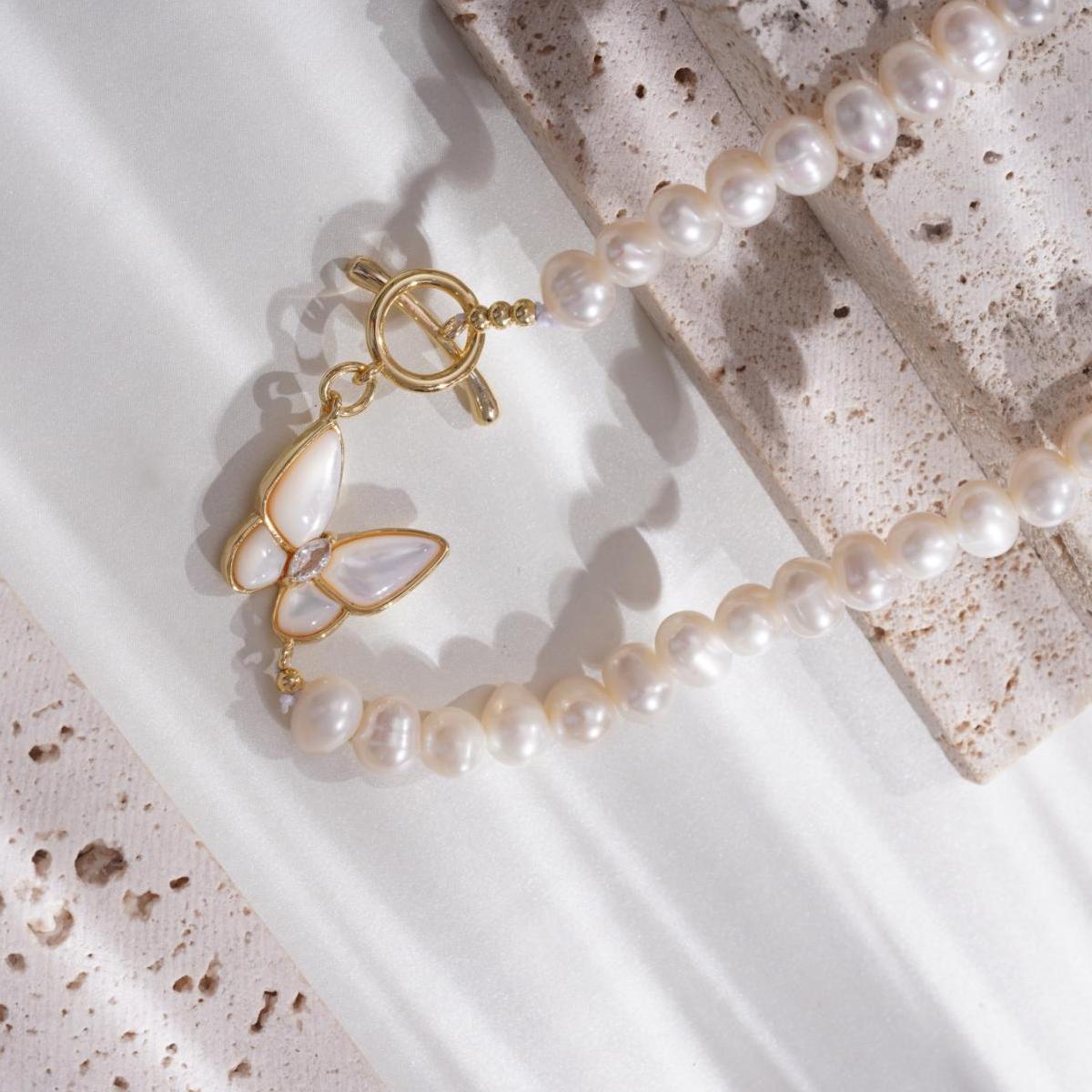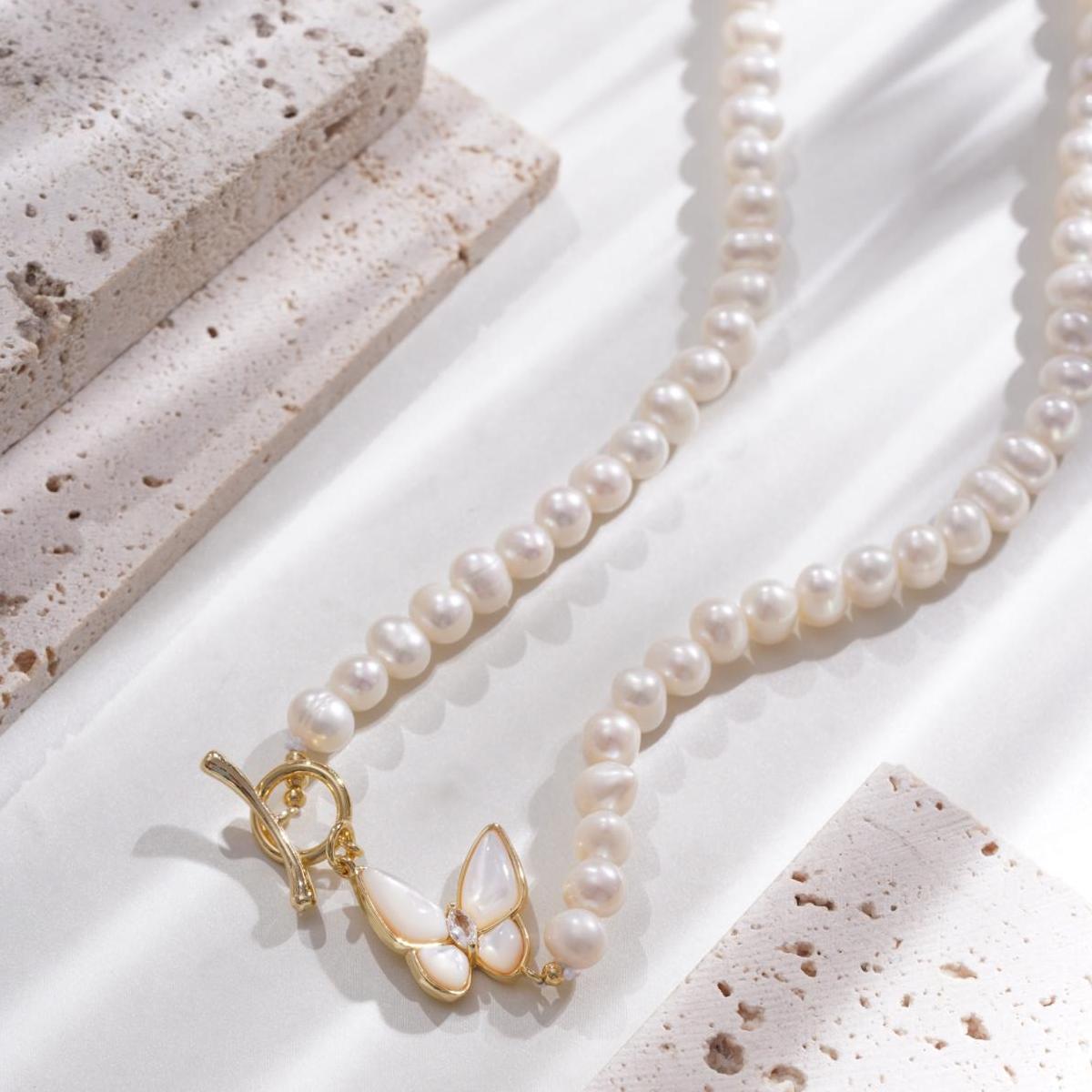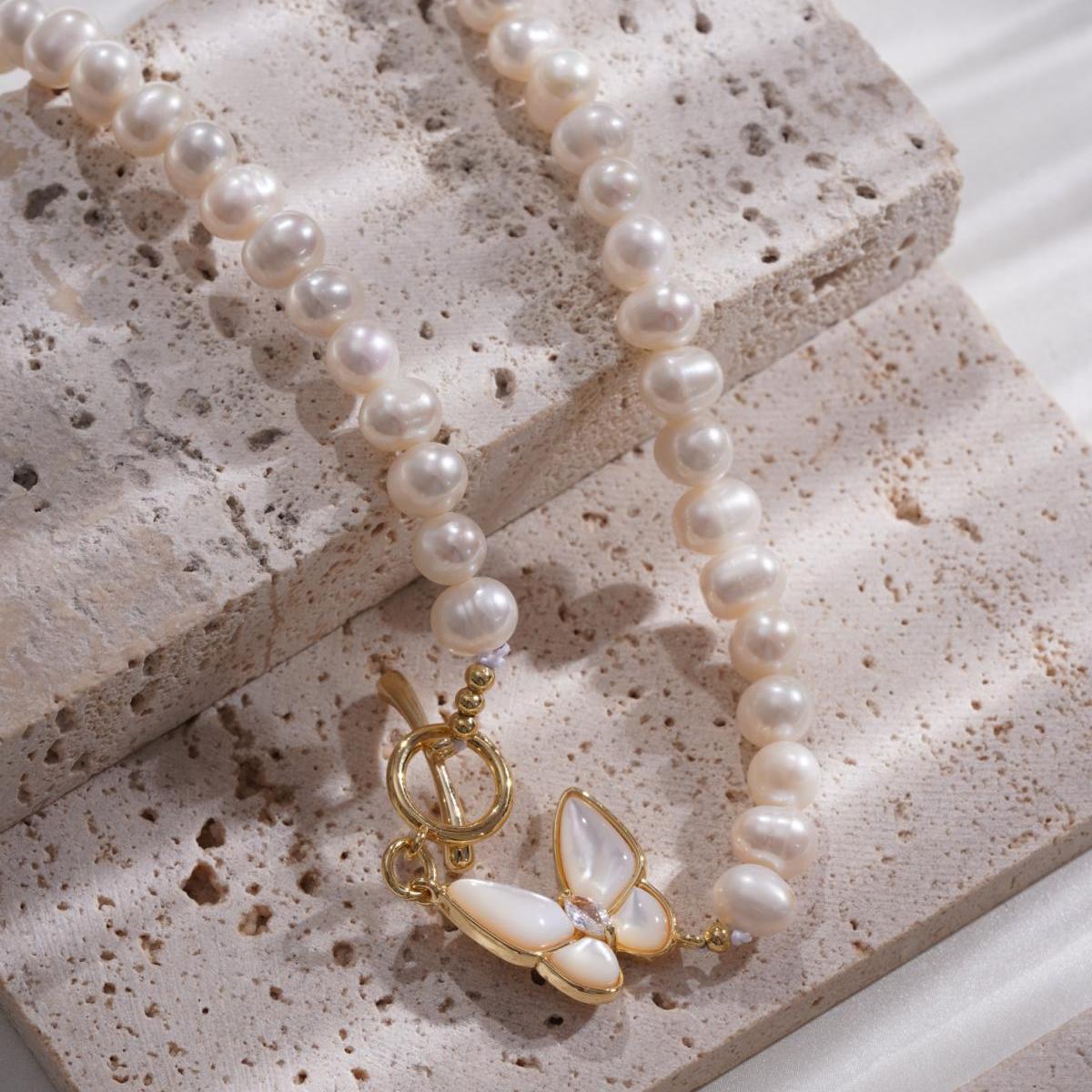 Crafted with meticulous care, this necklace features naturally beautiful freshwater pearls strung together to create a lustrous and refined surface with organic charm. The chain is thoughtfully made from hypoallergenic 925 sterling silver, offering a comfortable, irritation-free wearing experience that gently protects delicate skin. The design showcases an exquisite butterfly motif brought to life: its elegantly unfurled wings are artfully shaped by multiple freshwater pearls, forming fluid lines and a dynamic posture; the butterfly’s body is meticulously rendered as a single, dazzling zirconia stone, radiating brilliant sparkle. Graceful and sophisticated, the overall design symbolizes a woman’s transformative growth, embracing a shining life — like a butterfly emerging from its cocoon to spread its wings and radiate brilliance.