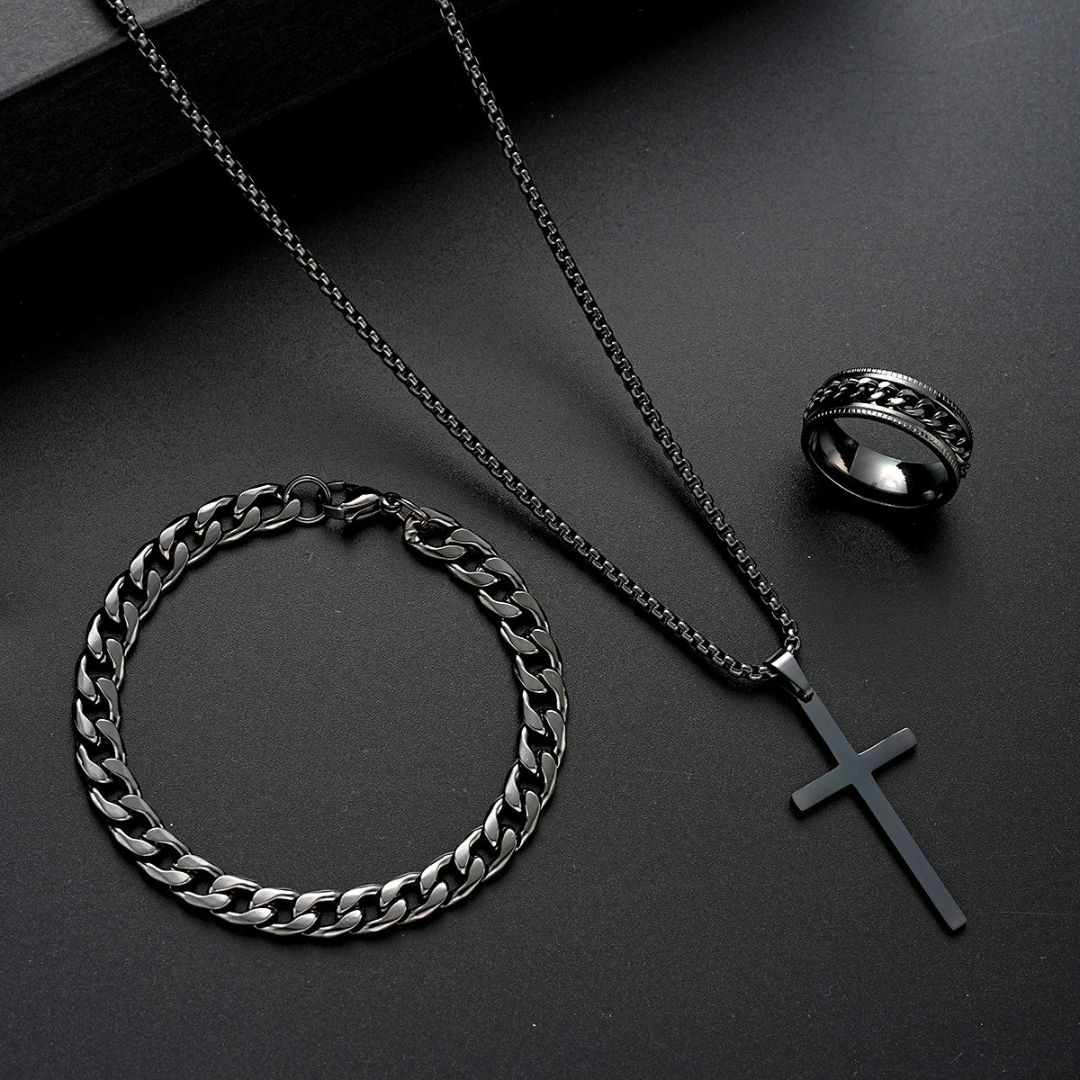 Fashion Punk Black Color Cross Pendant Necklace Bracelet Ring Set for Men Boys Hip Hop Stainless Steel Jewelry Set Party Gifts