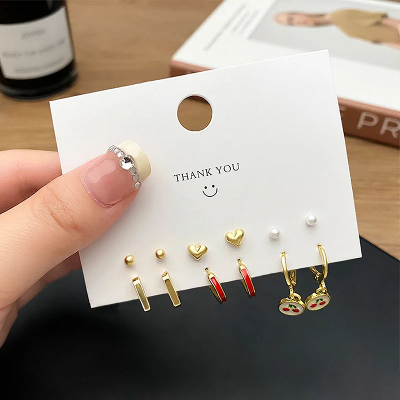 Gold Color Metal Pearl Chain Love Heart Earring Irregular Geometric Cherry Hoop Earrings for Women Gifts Jewelry 6pcs Set