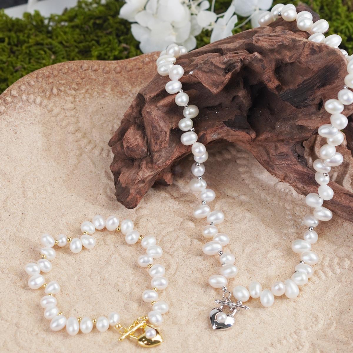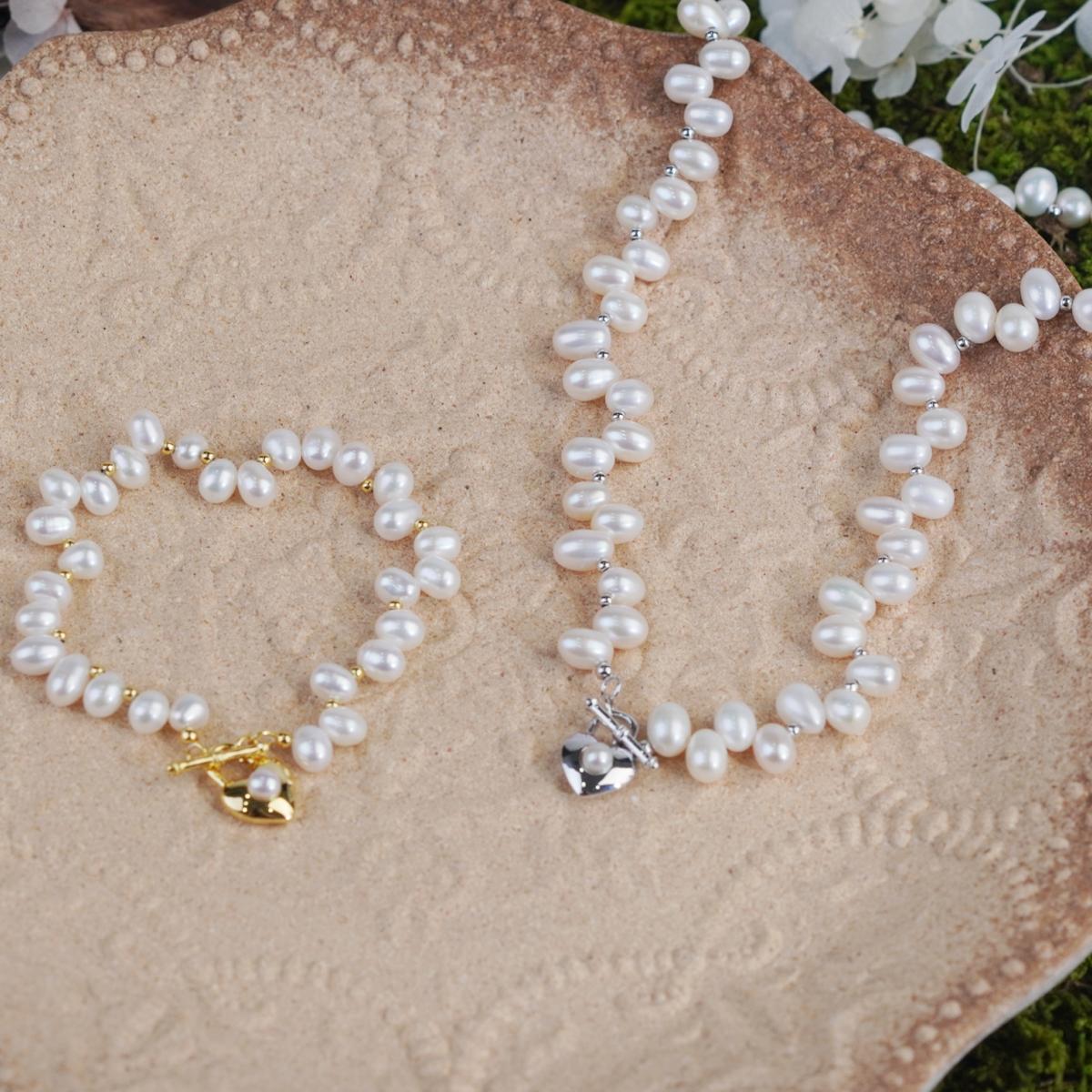 This bracelet features an exquisite combination of silver and natural freshwater pearls. The chain is composed of warm gold-toned silver beads alternated with plump, round white pearls. A heart-shaped silver pendant is adorned with a pearl, and the clasp is designed with an OT mechanism, ensuring both practicality and refined aesthetic details.