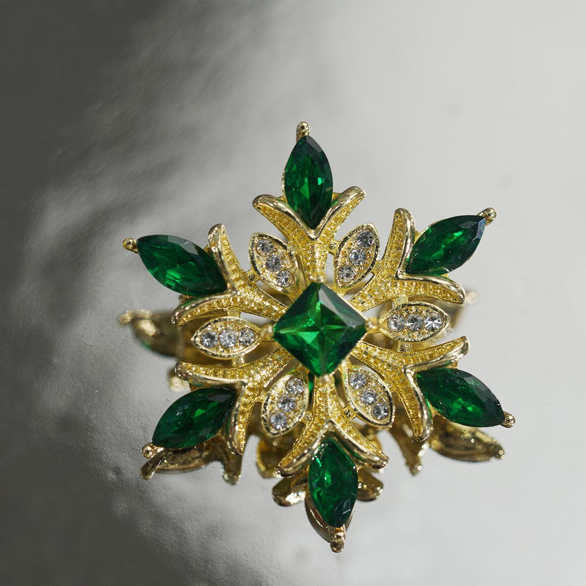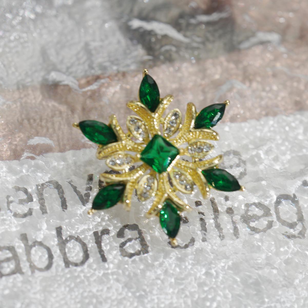 A symmetrically radiant snowflake brooch centered by a deep green square-shaped stone. Features petal-like metallic contours adorned with teardrop green stones and sparkling crystal accents. Secure pin back for versatile styling.