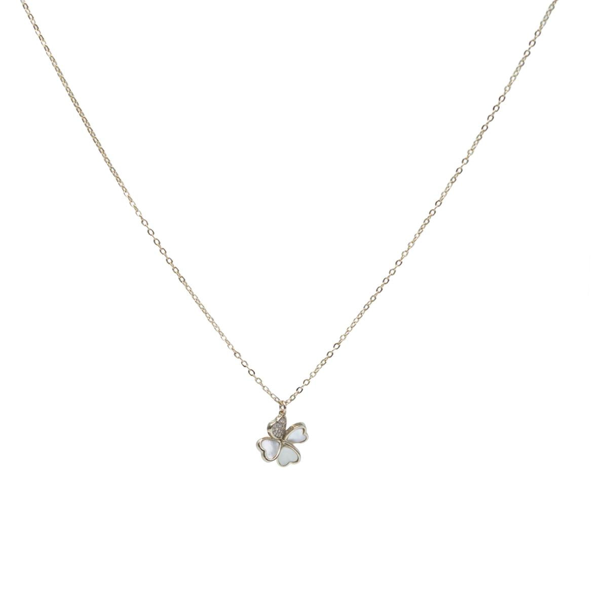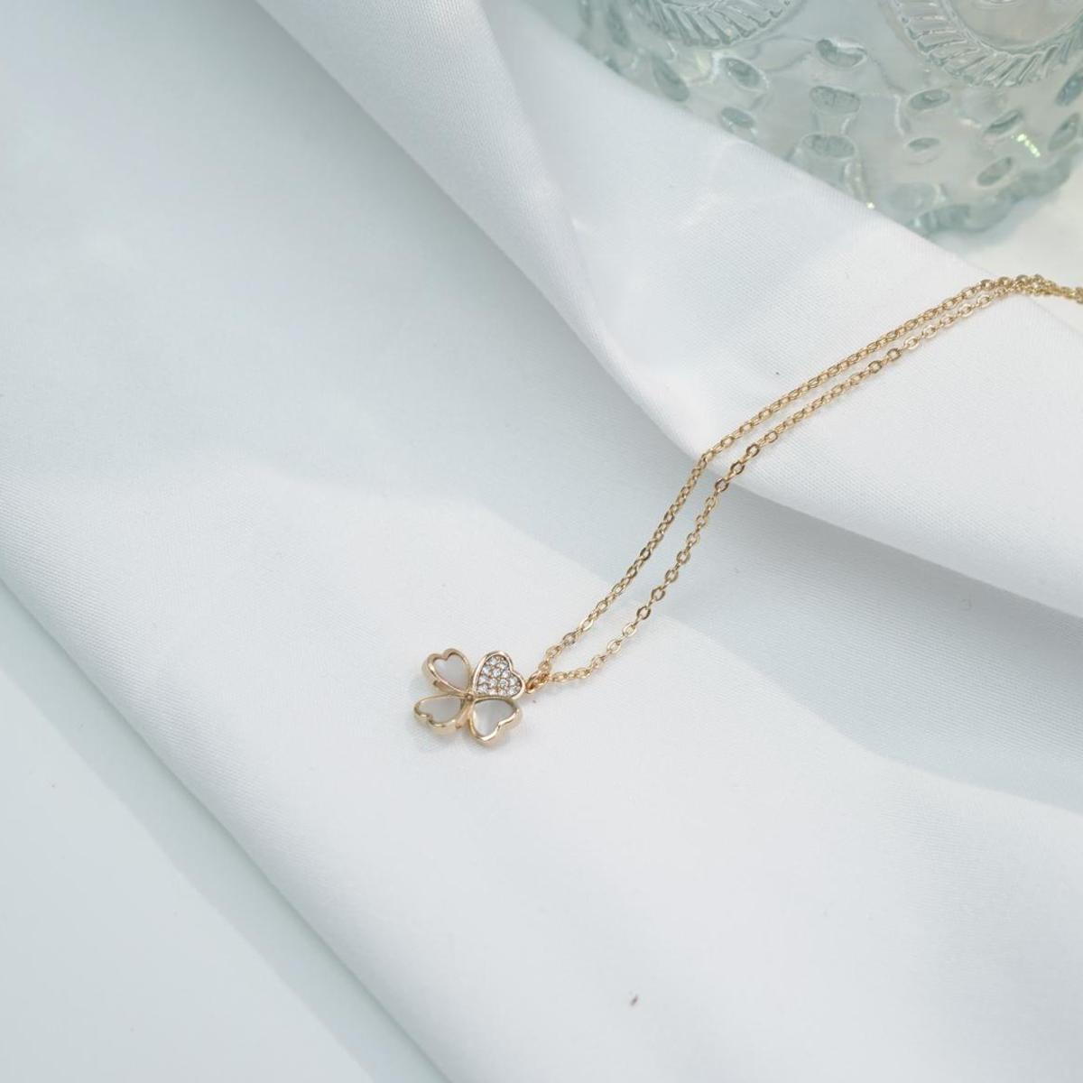 This refined four-leaf clover necklace combines organic elegance with subtle sparkle. The pendant features three matte pearl-shell leaves and one crystal-adorned leaf, suspended from a delicate twisted chain that enhances its lightweight drape.